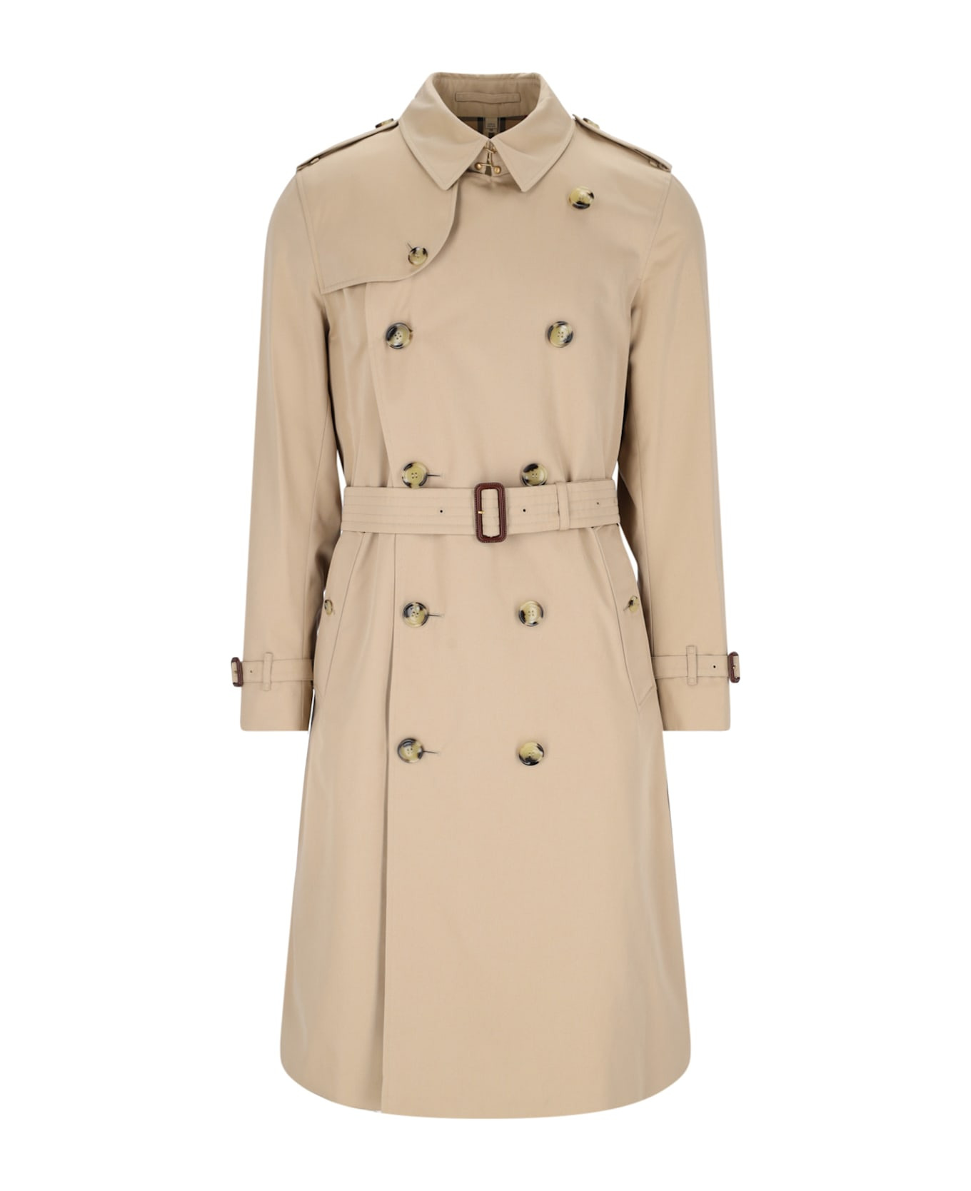 Burberry double-breasted beige cotton trench coat with classic collar, adjustable straps on the cuffs, button closure and adjustable belt at the waist, two side button pockets, central back vent, straight hem. Composition: 100% Cotton Made in: United Kingdom Color: NEUTRALS Size and fit: - vestibilita regolare Model number: 8079385MW