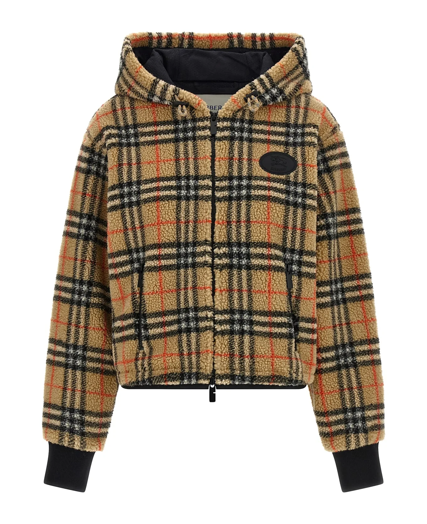 'Fiona' cashmere and wool blend fleece jacket knitted with Burberry Check, breathable mesh lining, adjustable hood, silicone 'Equestrian Knight Design' patch and front zip closure, pockets, long sleeves with ribbed knit cuffs and dropped shoulder, drawstring at the hem. Composition: 47% wool 45% polyester 8% cachemire Made in: Portugal Color: Beige Size and fit: - true to size fit Model number: 8118929SANDIPCHECK