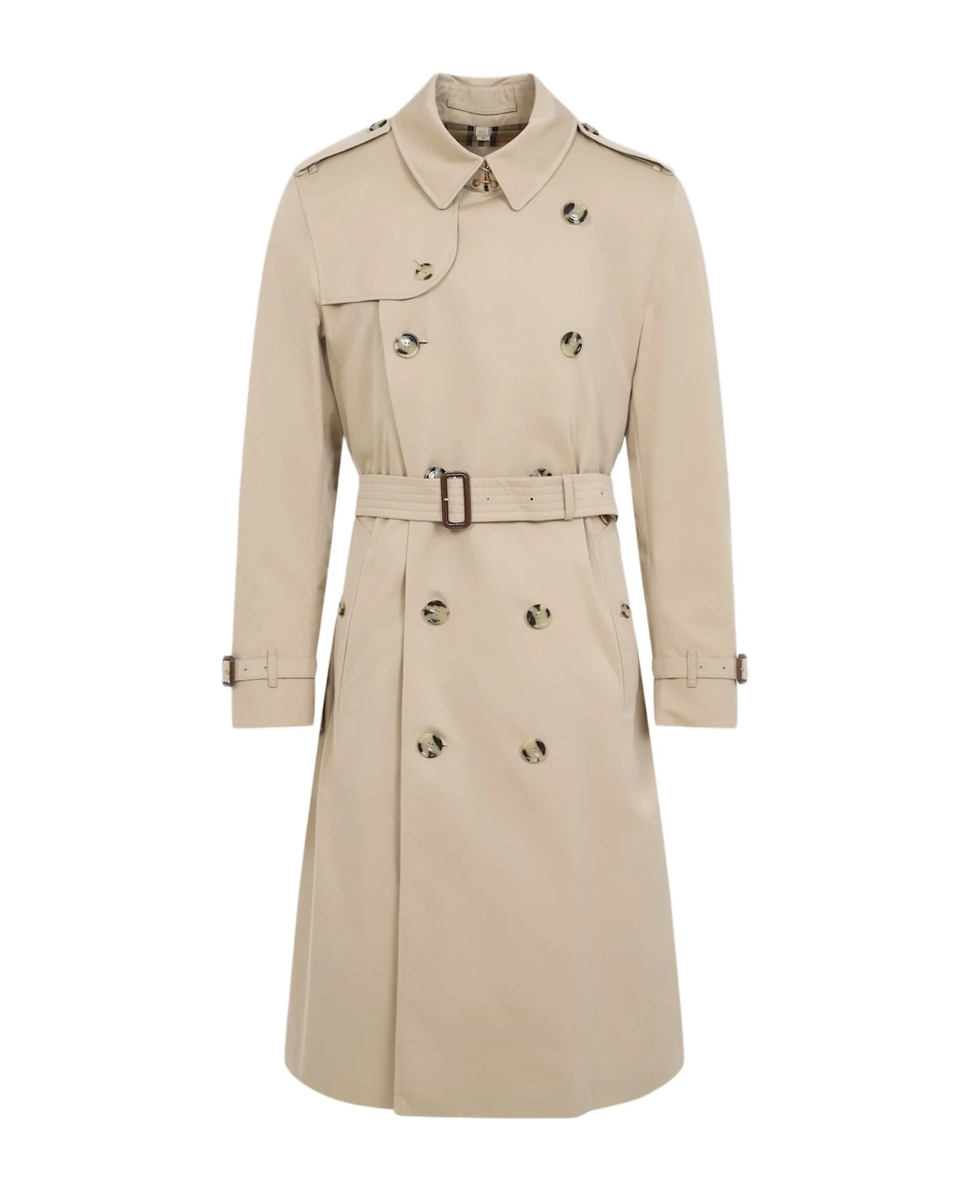 Burberry Honey Long Cotton Trench. Honey beige cotton, pointed collar, button tabs at the shoulders, double-breasted with button closure, tonal adjustable belt on the waist, front pockets with button fastening, adjustable straps on the cuffs, back central vent, lined. Made in: United Kingdom Color: Honey Model number: 8079385A1366