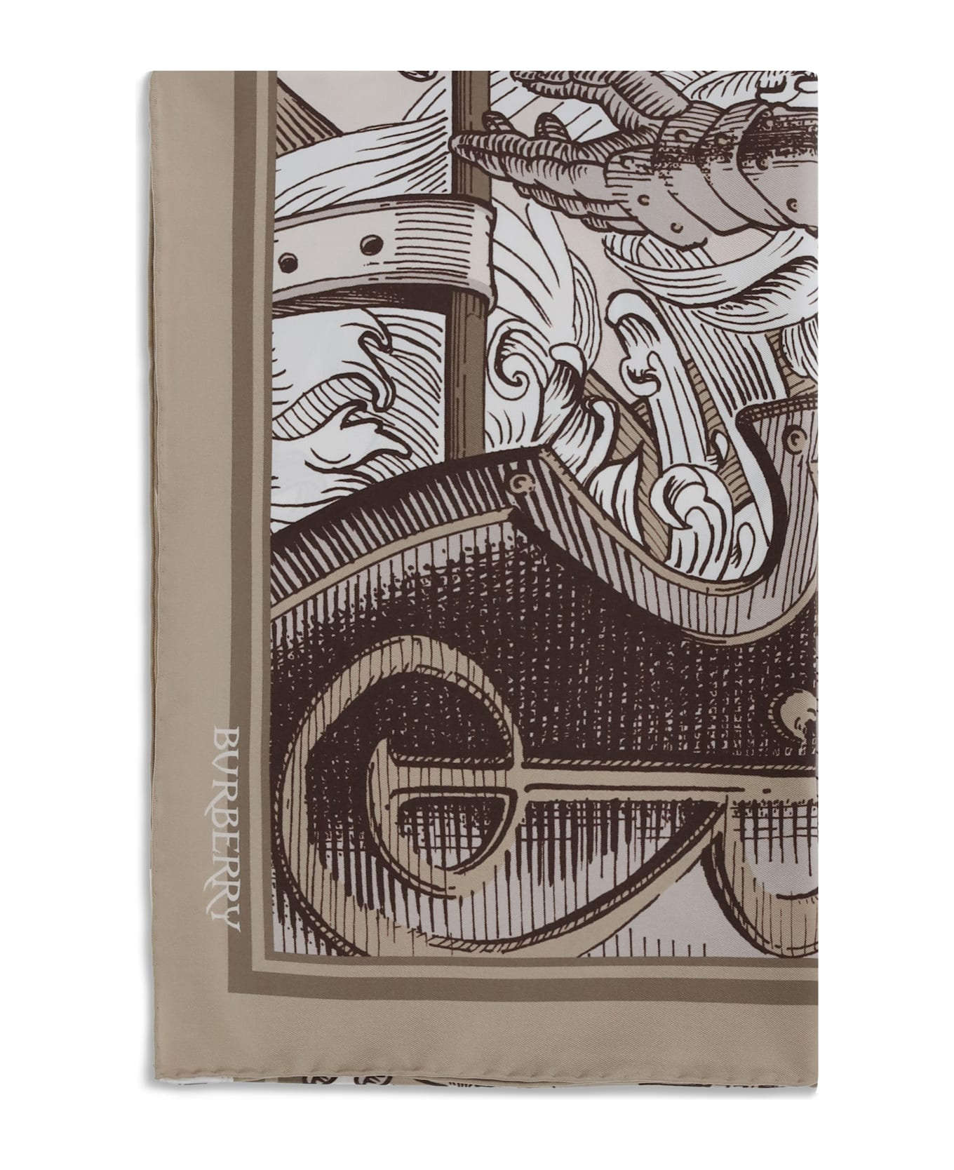Burberry's knight engraving print silk scarf is a fine accessory, made in italy from silk twill. the print, hand-drawn in an antique engraving style, depicts details of the iconic equestrian knight design, with the knight's armor alongside the b shield and a banner. a tribute to the maison's legacy of elegance and graphic art. Composition: 100% % Silk Made in: Italy Model number: 8114819C3470