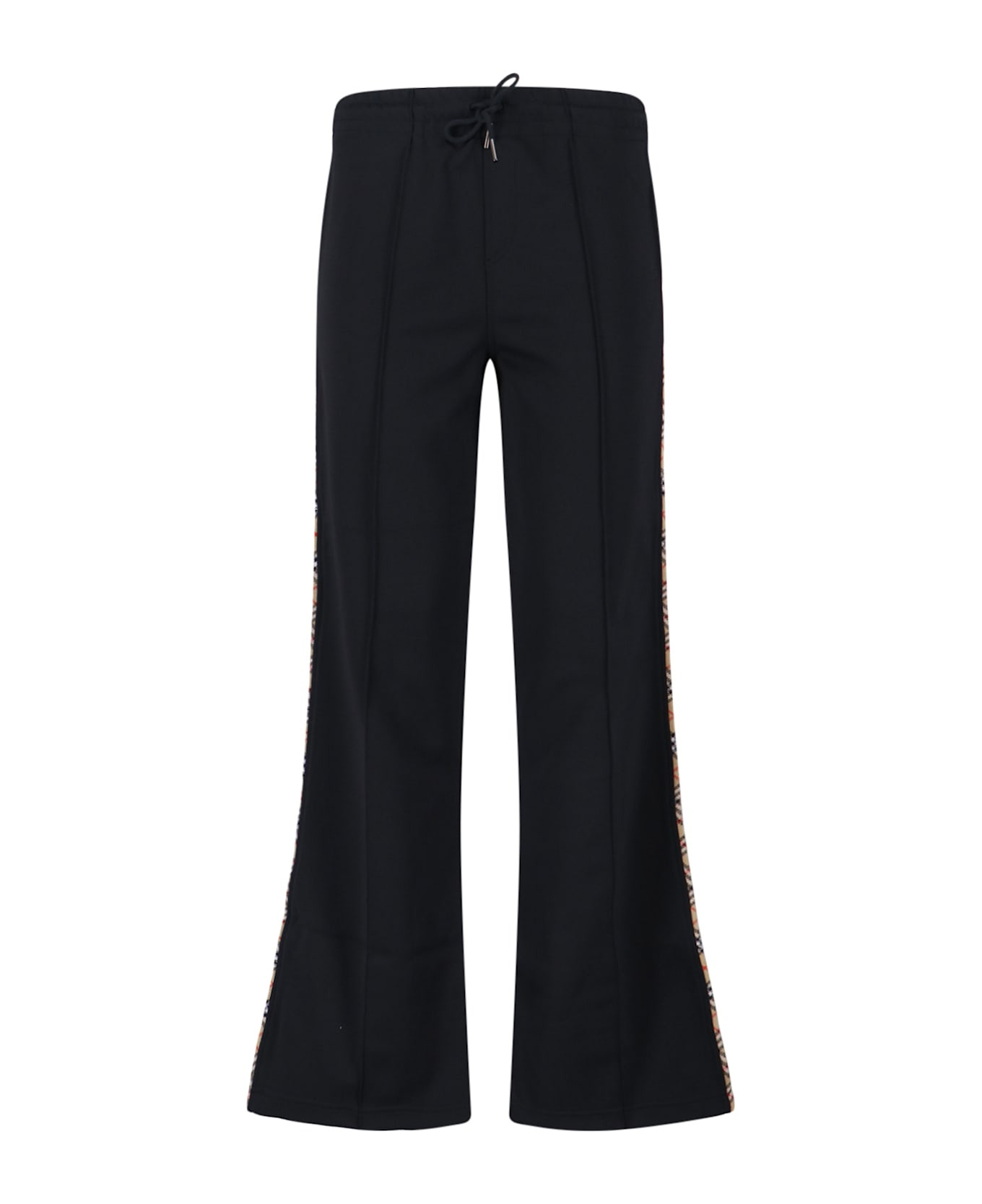 Burberry black cotton blend track pants with elastic mid waistband, drawstring closure, two front pleats, side 'Check' logo bands, back welt pocket, flared leg. Composition: 54% Polyester, 46% Cotton Made in: Portugal Color: Black Size and fit: - Vestibilita regolare Model number: 8109713A1189