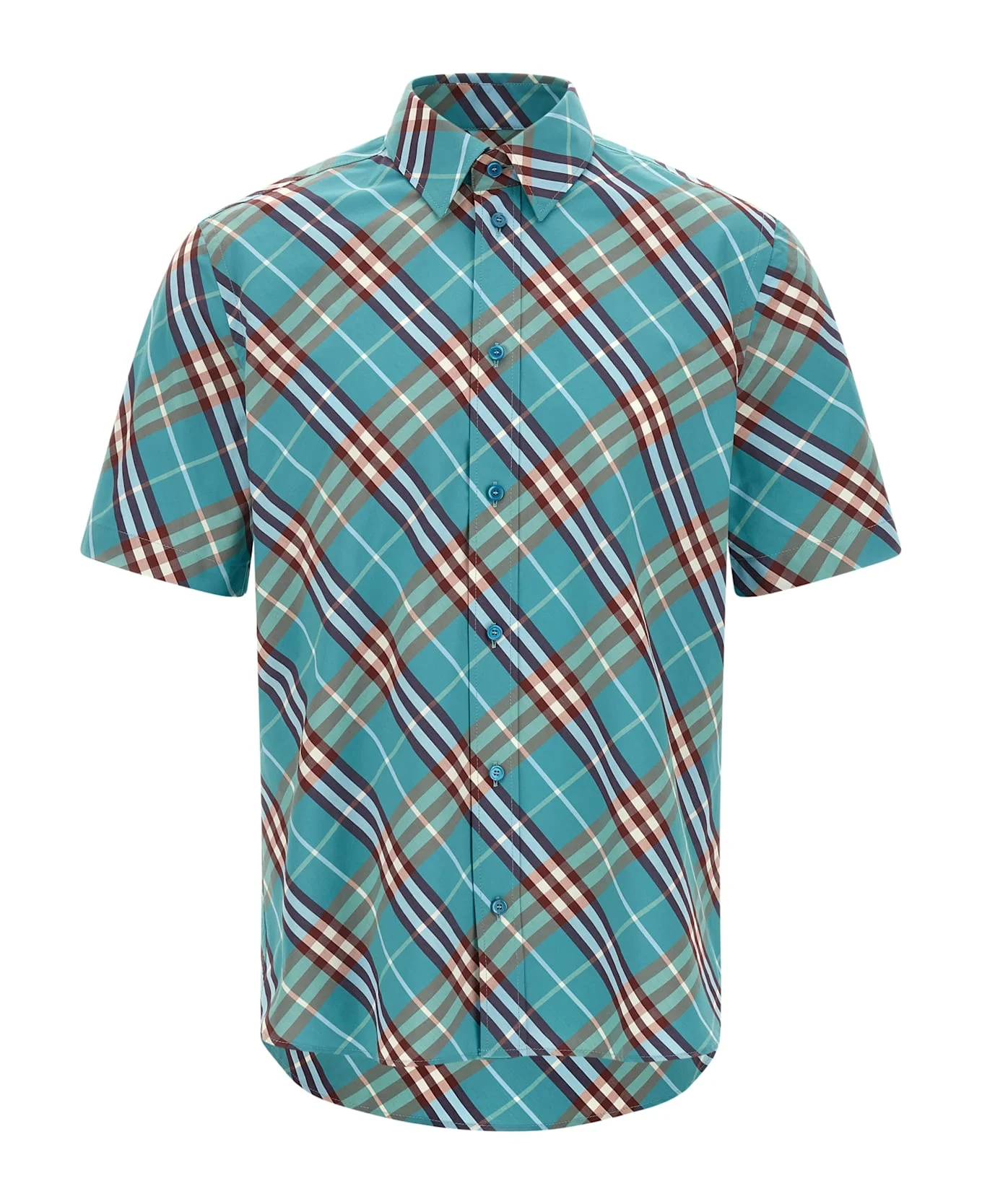 Burberry Check print cotton poplin Robert shirt with front button closure, and short sleeves. Composition: 100% cotton Made in: Italy Color: Light Blue Size and fit: - true to size fit Model number: 8120427ATOMBLUEIPCHECK