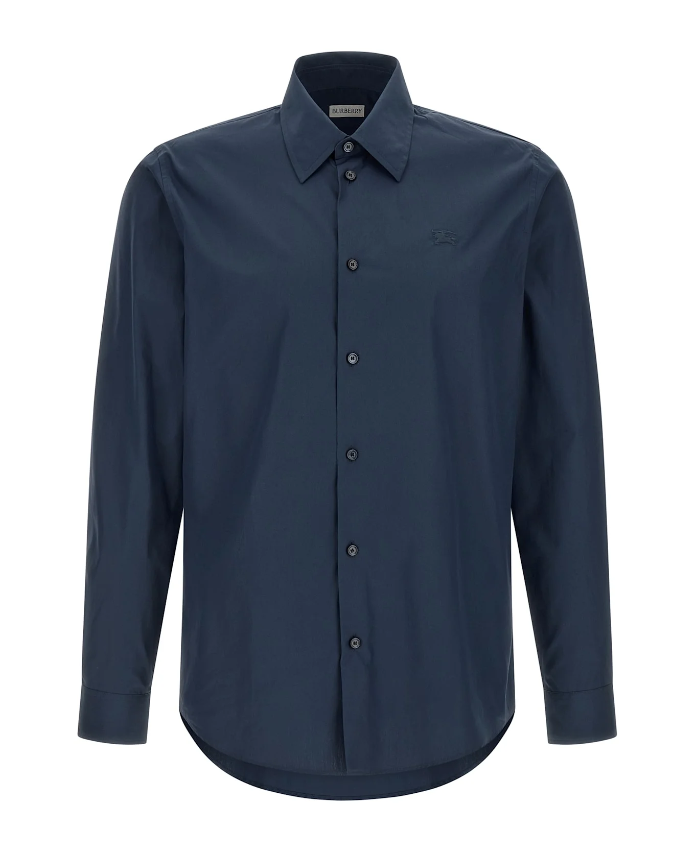 'Sam' cotton poplin shirt with Burberry Check inner details, tone-on-tone 'Equestrian Knight Design' logo embroidery and front button closure, long cuffed sleeves and rounded hem. Composition: 100% cotton Made in: Italy Color: Blue Size and fit: - true to size fit Model number: 8122006DARKGRAPHITEBLUE