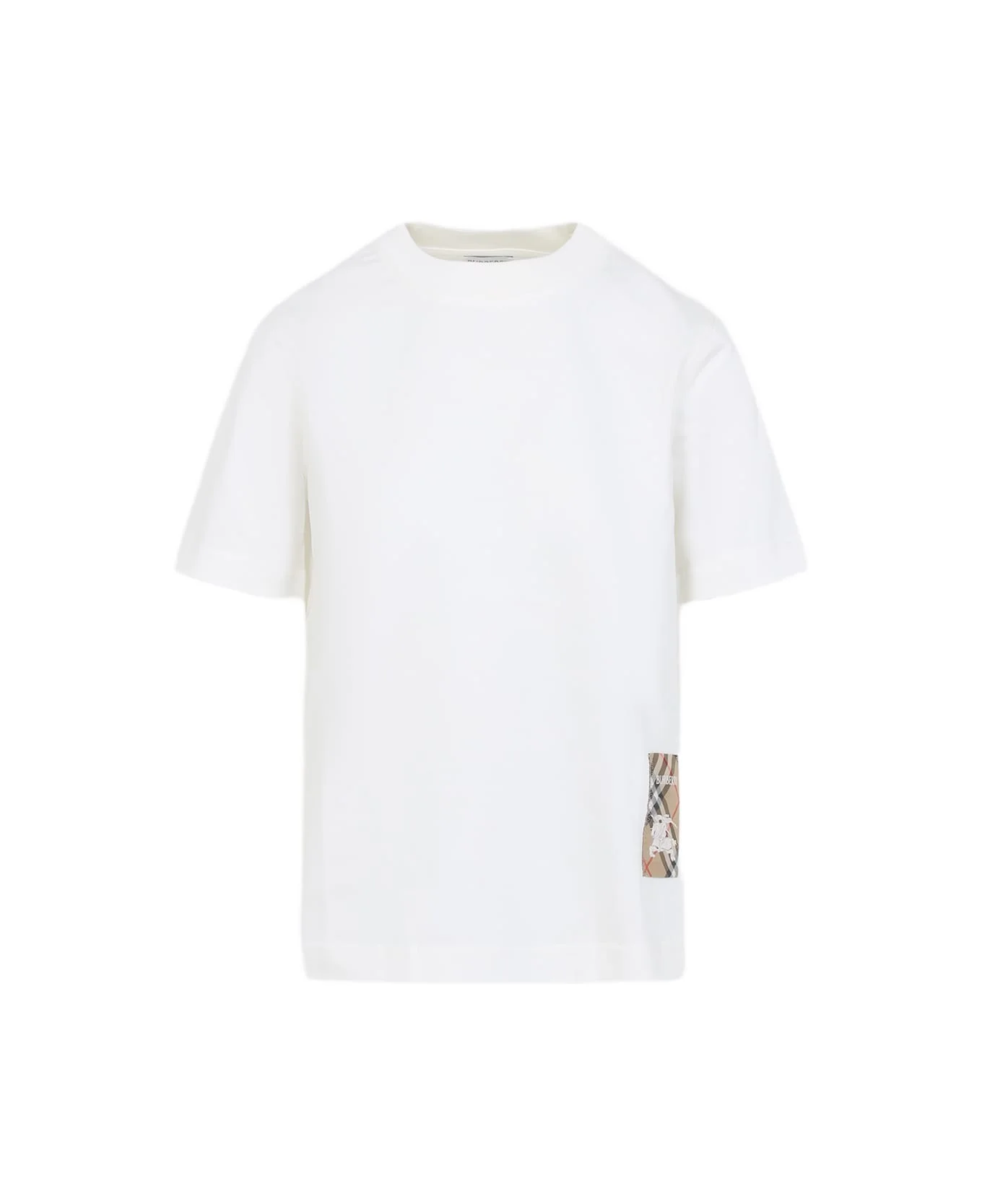 Burberry Chalk White Cotton T-Shirt. Pure chalk white cotton t-shirt, round neck, short sleeves, straight hem. Side signature beige, black and red checked patch with white embroidered logo. Made in: Portugal Color: Chalk Model number: 8104886B7078