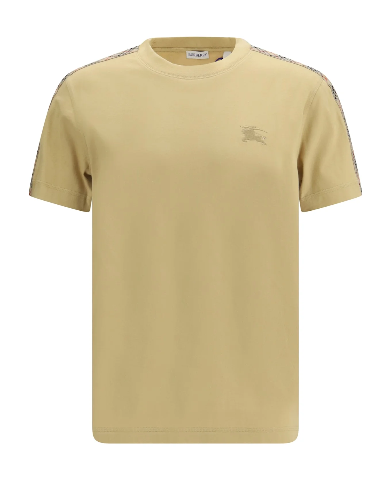 The t-shirt with check trims by burberry combines a clean design with the brand s iconic details. crafted from cotton, it features burberry check accents on the sleeves, a ribbed crew neck and the embroidered equestrian knight design on the chest. the slim fit enhances the silhouette, making it a refined and versatile everyday piece. Composition: 100% % Cotton Made in: Vietnam Model number: 8106247B8626