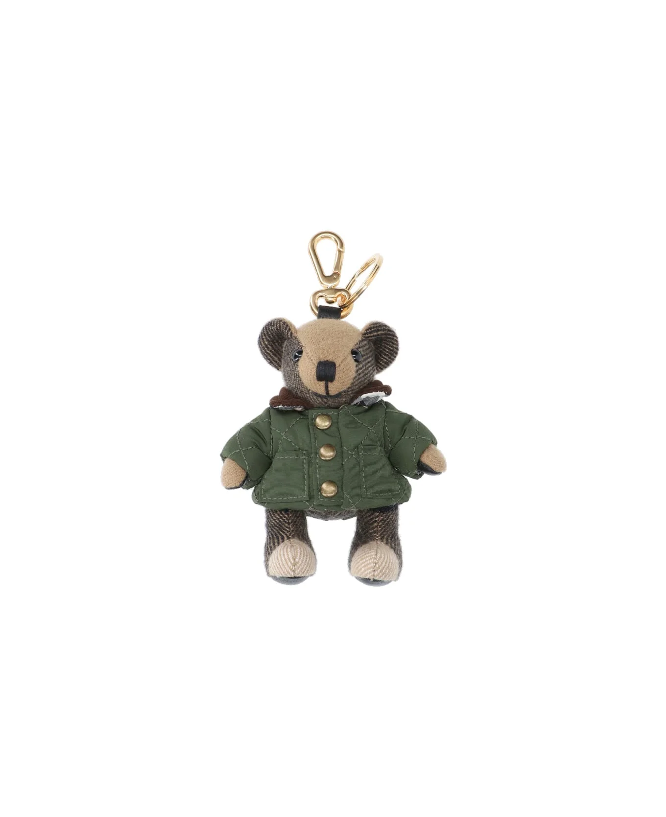 Burberry Thomas bear keyring charm in green cashmere with strap, gold metal nameplate, engraved logo detail, gold metal ring keyring, and snap hook closure. Composition: 100% Cashmere Made in: China Color: Green Model number: 8120170C1748