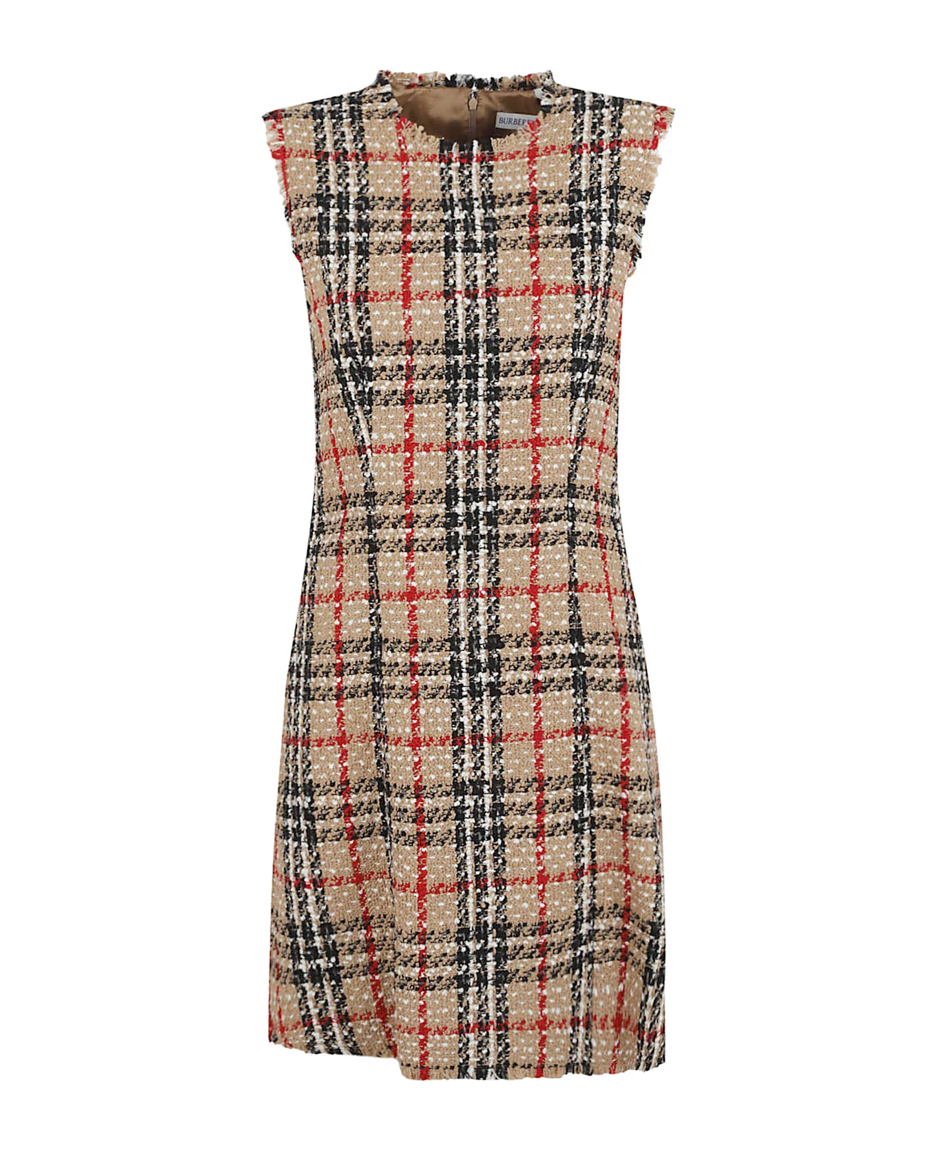 Beige checked pattern with fringed edge, sleeveless, round neckline, zip fastening. Made in: Italy Color: Sand Ip Check Model number: 8116014B9368