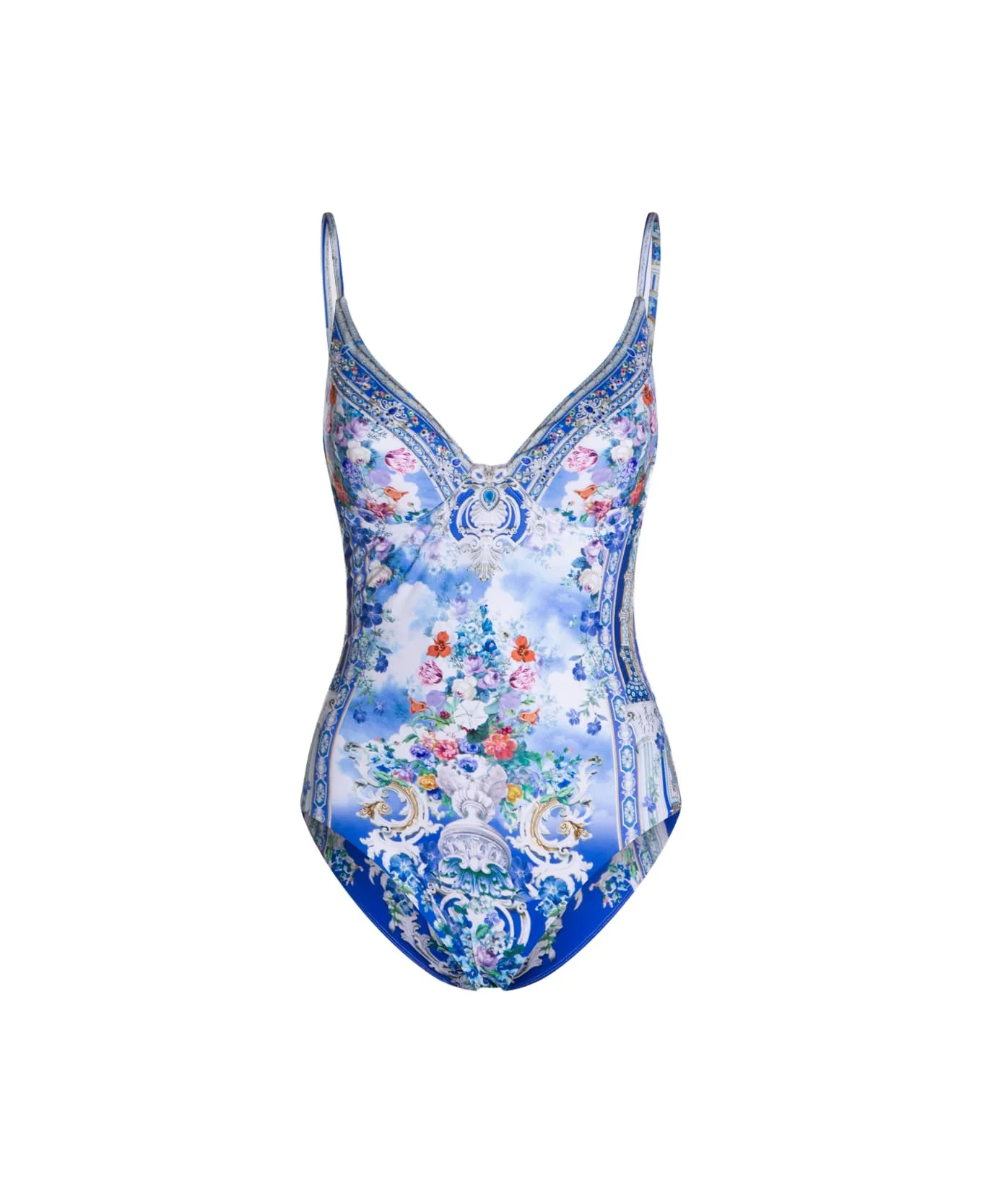 Blue beachwear from Camilla featuring adjustable straps, removable soft cups, underwire support, regular leg line, all over stamp and crystal embellishments. Composition: _, 82% Polyamide, 18% Elastane Made in: China Color: OTTOMAN OPULENCE Model number: 00039362OTTOOPPU