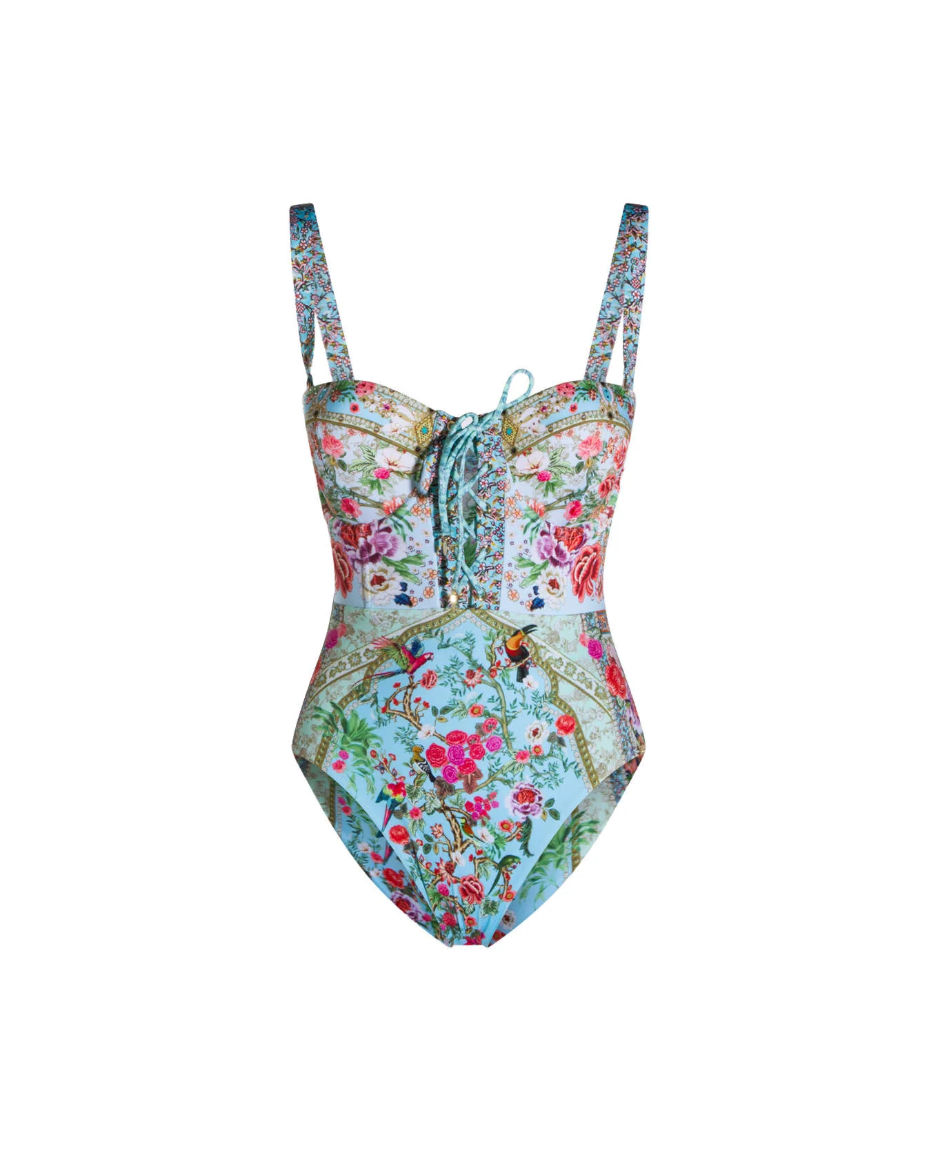 Light blue beachwear from Camilla featuring heart neck, adjustable straps, regular-to-low leg line, crystal embellishemnt, all over stamp and soft cups. Composition: _, 82% Polyamide, 18% Elastane Made in: China Color: SULTANS AND QUEENS Model number: 00039354SULTQUEN