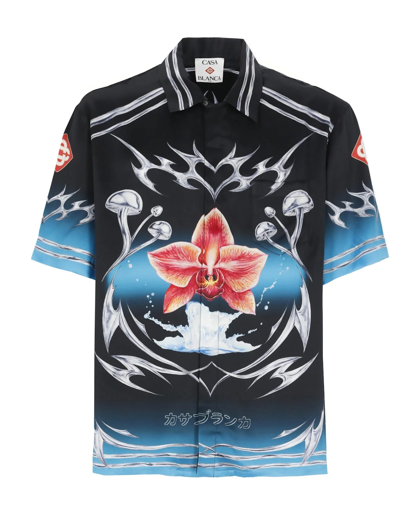 - Black Casablanca silk shirt for man - Collar - Front buttons fastening - Short sleeves - One front welt pocket - All-over Blades print Composition: 100% Silk Made in: Italy Color: Multicolor Model number: MAW25SH00303SILK