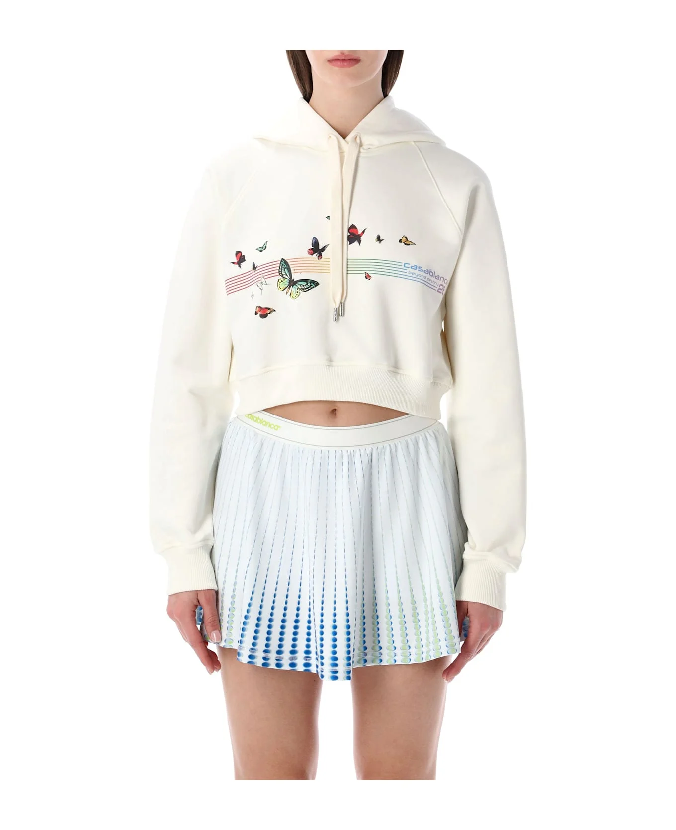 The Casablanca Butterfly Crop Hoodie Features A Cropped Silhouette With Long Sleeves And A Hood, Crafted From Soft Fabric With A Vibrant Butterfly Print Across The Front. Designed For Casual Elegance And Comfortable Wear, It s Perfect For Layering Or As A Statement Piece In Everyday Styling. Cotton Fabric Drawstring Hood Long Sleeves Vibrant Butterfly Print On The Front Rib Trims Alessandra Is 1,75 M And Wears Size S Composition: 100% organic cotton Made in: Portugal Color: OFF WHITE Model number: WSP26JTP36301