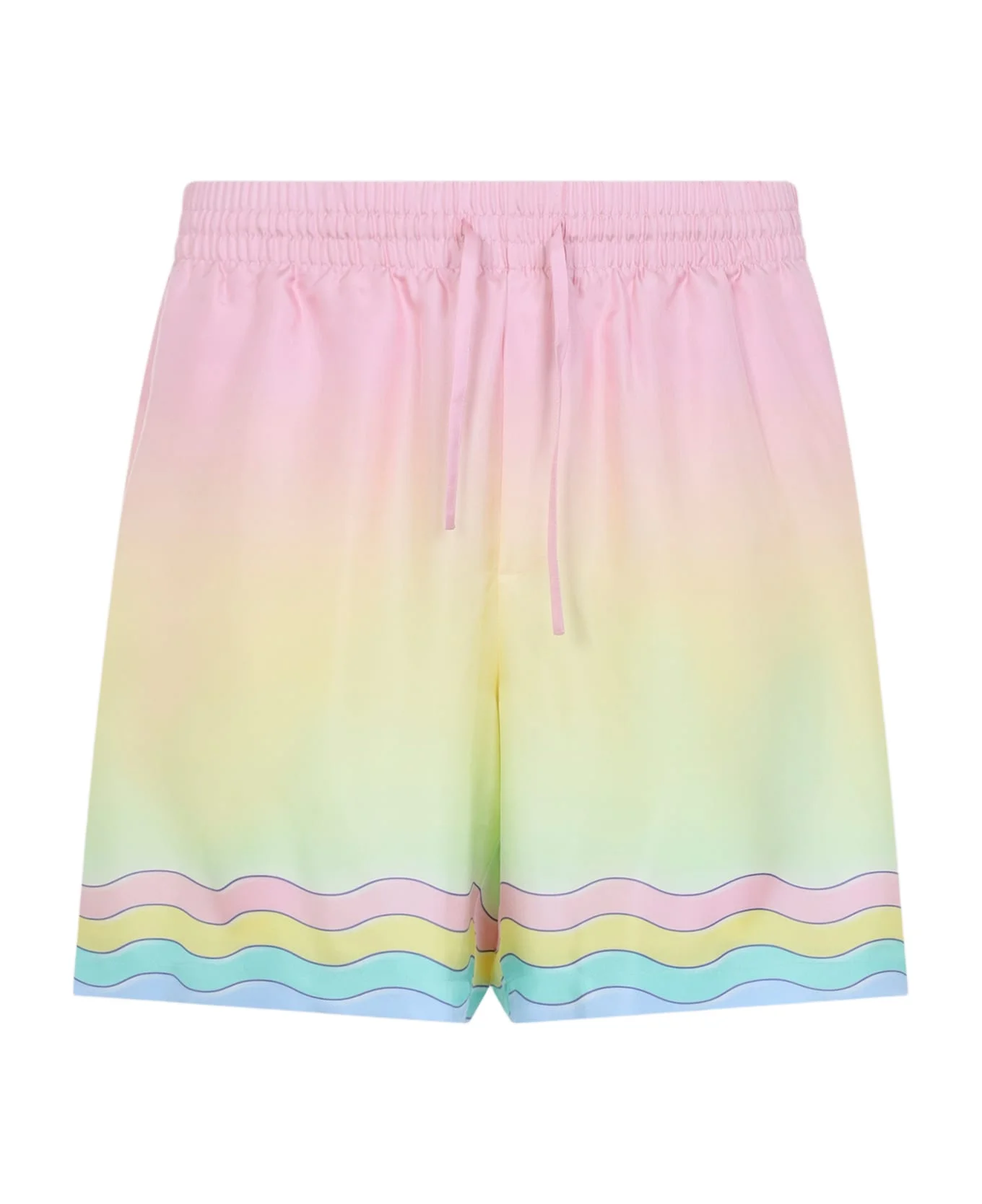 Casablanca Multicolor Silk For The Love Of Dance Silk Shorts. Pure silk shorts, elastic waist, front drawstring details, side pockets, back patch pocket with logo, straight hem. Pink, blue and yellow wave details near the hem. Pink, yellow and blue shades. Made in: Italy Color: Multi Model number: MSP26TR39902MULTI
