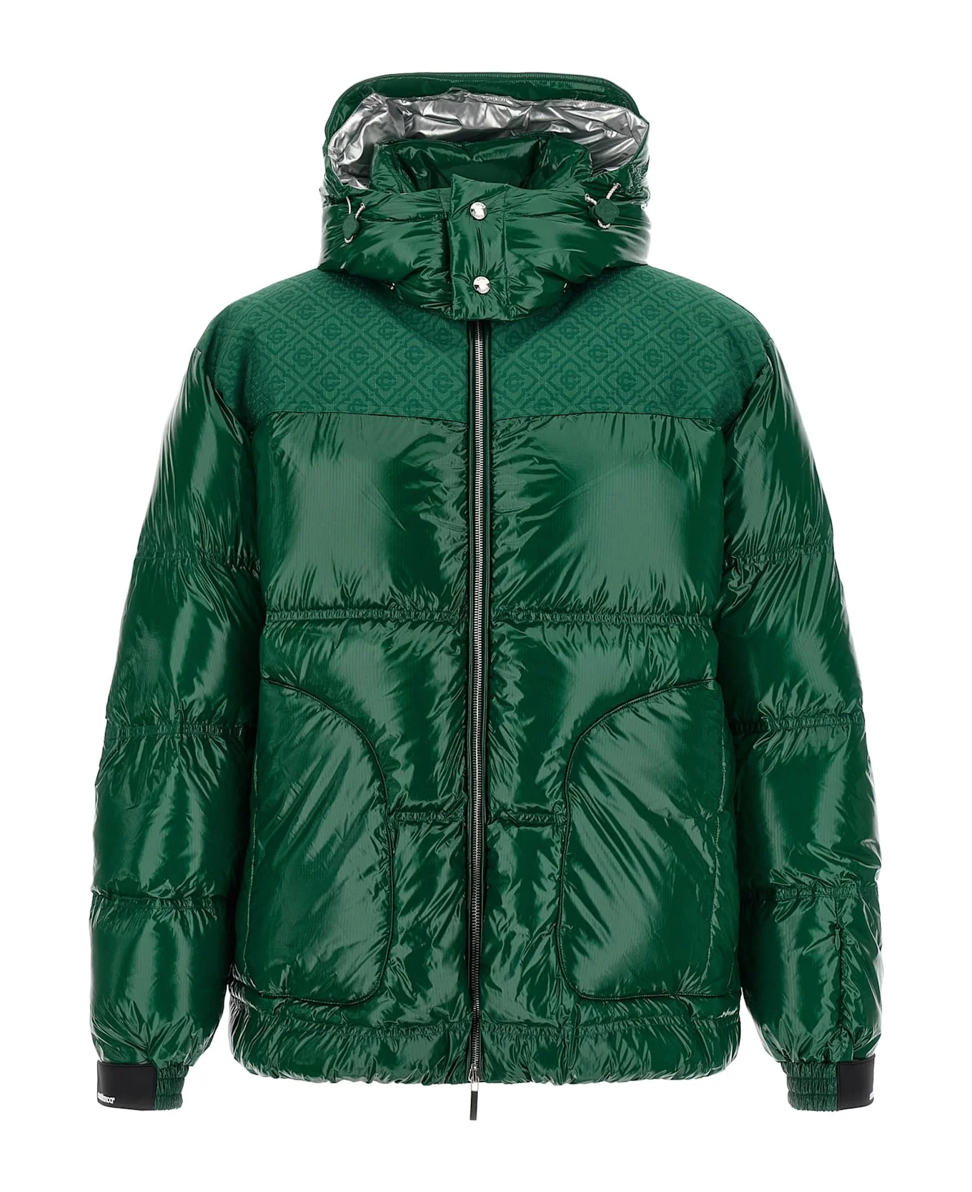 'Nylon Puffer' down jacket in ripstop nylon fabric with goose down padding, jacquard panel with tone-on-tone monogram on the shoulders, adjustable and removable hood, standing collar, front zip closure, pockets, long sleeves with adjustable elastic cuffs, elastic hem. Composition: 100% polyamide Made in: Italy Color: Green Size and fit: - Relaxed fit Model number: MPF25OT19701GREEN