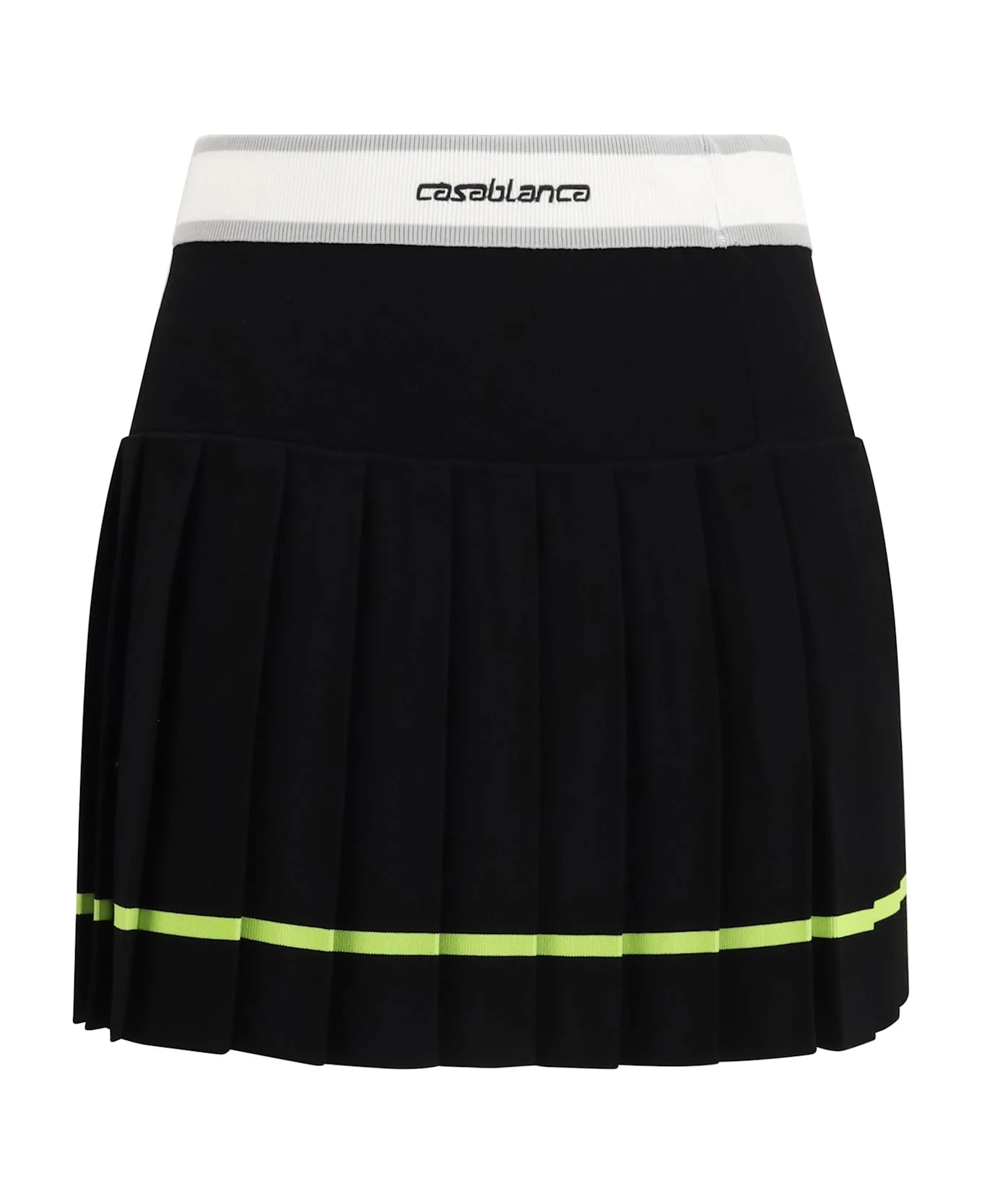 The striped pleated skirt by casablanca is a mini skirt with a structured silhouette that reflects the house s refined, atelier-inspired approach to sportswear. crafted from viscose fabric, it features an elasticated waistband with the casablanca logo, a smooth yoke, and a pleated panel finished with a yellow stripe at the hem for a graphic, distinctive touch. Composition: 83% % Viscose, 17% % Polyester Made in: China Model number: WSP26KW123401BLACK