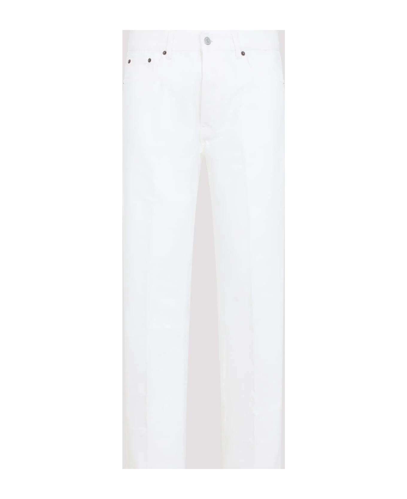 Celine Boyfriend 001 White Cotton Jeans. Crafted from white cotton denim, mid-waist, belt loops, 5-pocket construction, front concealed button fastening, leather label with Triomphe logo at the center back waist, straight leg. Made in: Italy Color: White Heavy Stone Wash Model number: RP0DI789DGFV7