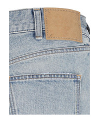 Celine 'Dylan' jeans in light blue denim with distressed wash, mid waist, belt loops, button and zip closure, five pockets, beige logo patch on the back, straight leg. Composition: 100% Cotton Made in: Italy Color: Light Blue Size and fit: - vestibilita: regolare Model number: 2N423789D08KW