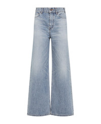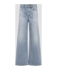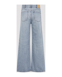 Celine Jolene Light Blue Cotton Jeans. Crafted from washed light blue cotton denim, mid-waist, belt loops, 5-pocket construction, front Triomphe button and zip fly fastening, leather label on the back waist, flared leg, regular fit. Made in: Japan Color: Golden Blue Wash Model number: RP055967WGBA5