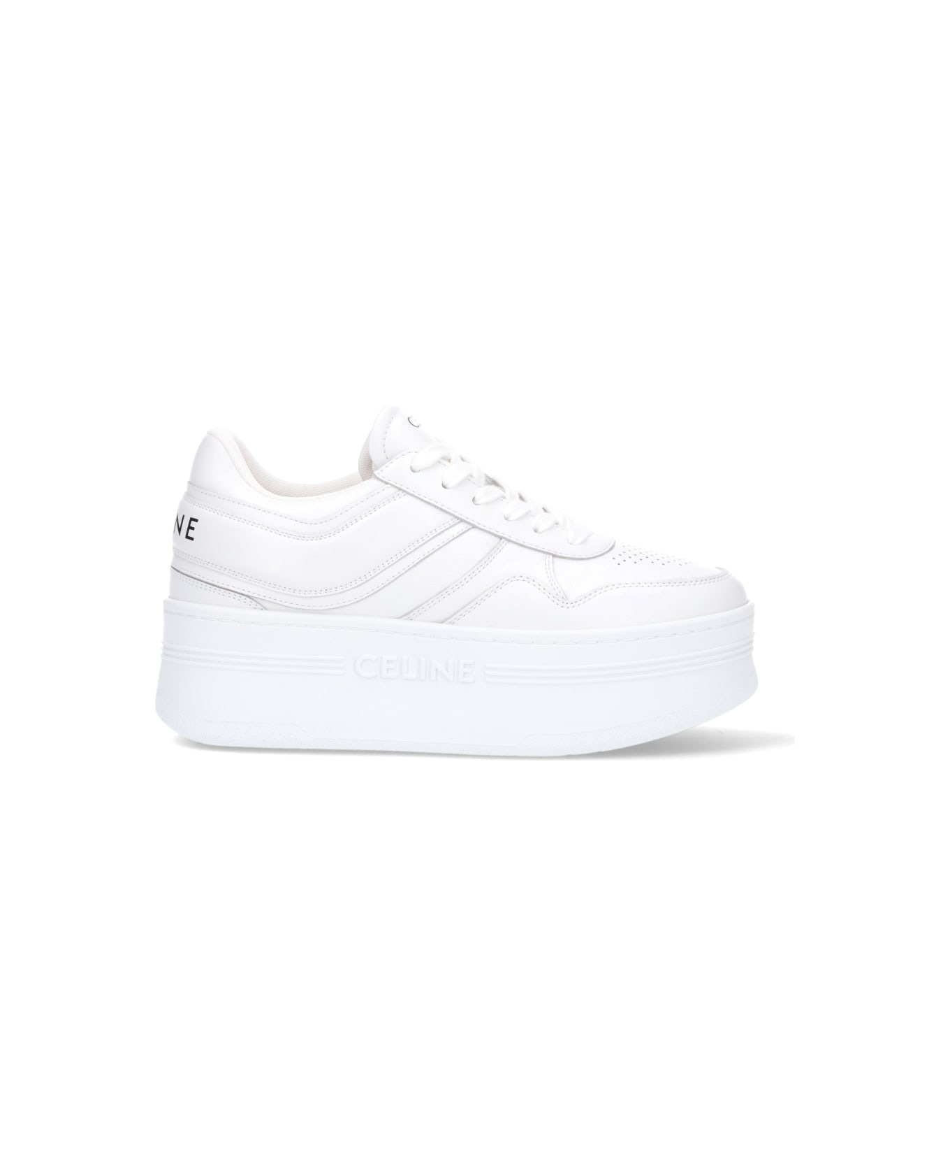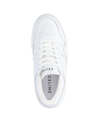 Celine white leather sneakers with round toe, perforated upper, lace-up closure, black logo lettering at the tongue and back, rubber sole with tonal embossed logo detail and stripes. Composition: 100% Calf Leather Composition: 100% Calf Made in: Italy Color: OPTIC WHITE Model number: 346163338C01OP
