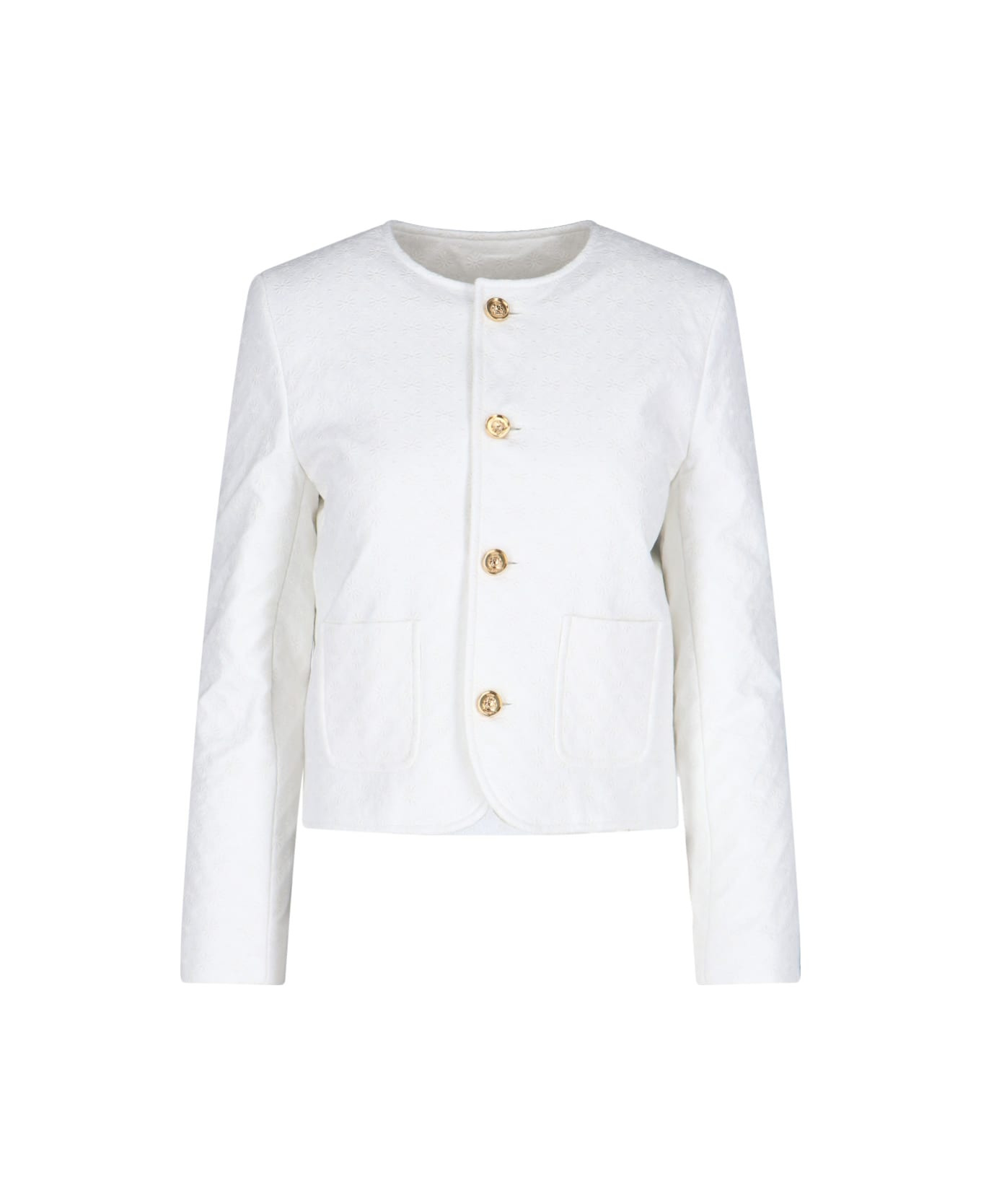 Celine 'Chelsea' quilted jacket in white cotton with tonal 'Triomphe' logo embroidery pattern, round neckline, logo button closure, two flat front patch pockets, button cuffs, straight hem. Composition: 100% Cotton Made in: France Color: White Size and fit: - vestibilita regolare Model number: RV0800536CAY4