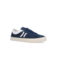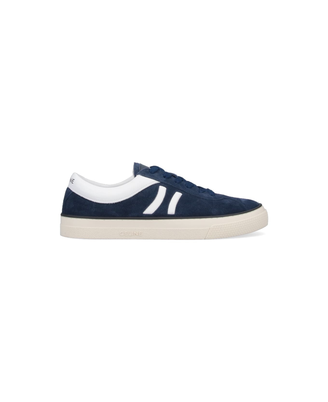 Celine 'Sunset' low-top sneakers in navy blue suede with round toe, lace-up closure, white logo print on the tongue, white leather bands on the side, white leather back tab, gold logo print detail, textured rubber sole, embossed logo detail on the side. Composition: 100% Calf Leather Made in: Italy Color: BLUE/OPTIC WHITE Model number: 362715079C07OH