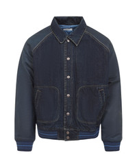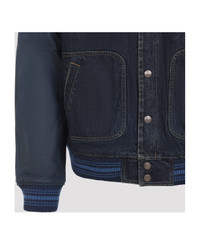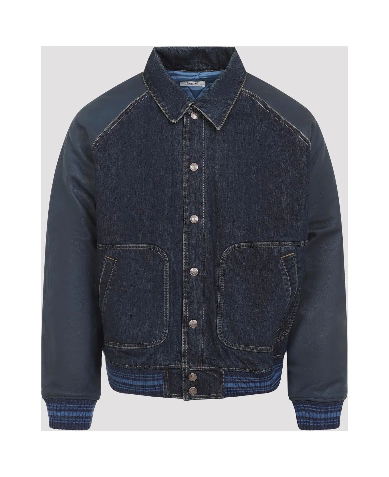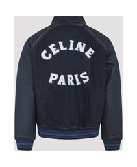 Celine Teddy Blue Cotton Jacket. Crafted from blue cotton denim, pointed collar, front button fastening, leather raglan long sleeves, two front pockets, logo embroidery on the back, ribbed cuffs and hem, lined. Made in: Italy Color: ETERNAL BLUE Model number: RV0TG787DGBV2