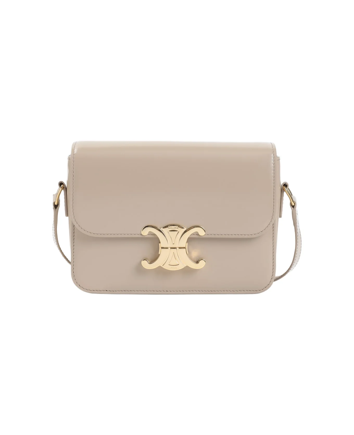 Celine Teen Triomphe Beige Calf Leather Shoulder Bag. Crafted from beige calf leather, golden-toned hardware, logo-shaped buckle closure, adjustable shoulder strap, three inner compartments, one internal zip pocket, leather lining. Color: Sa Safari Size and fit: - W:18,5cm H:13,5cm D:7cm Model number: 188423BF403SA