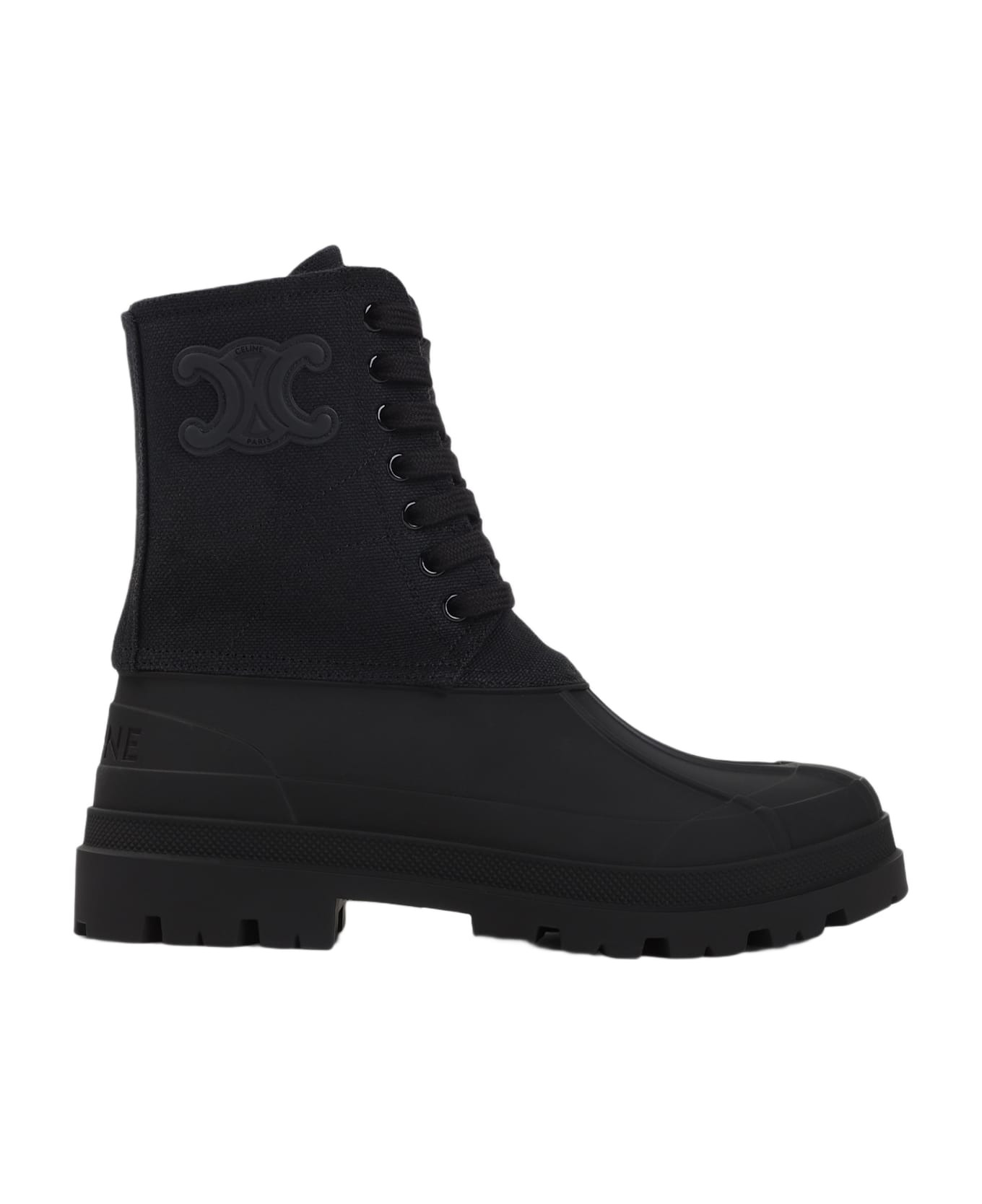 Celine Black Canvas Triomphe Boot. Pure black canvas boots, round toe, top tonal lace-up fastening, ankle-high, side tonal signature logo, back embossed lettering logo, tonal rubber sole. Made in: Italy Color: No Black Size and fit: - Heel high: 3cm Model number: 362422198C38NO