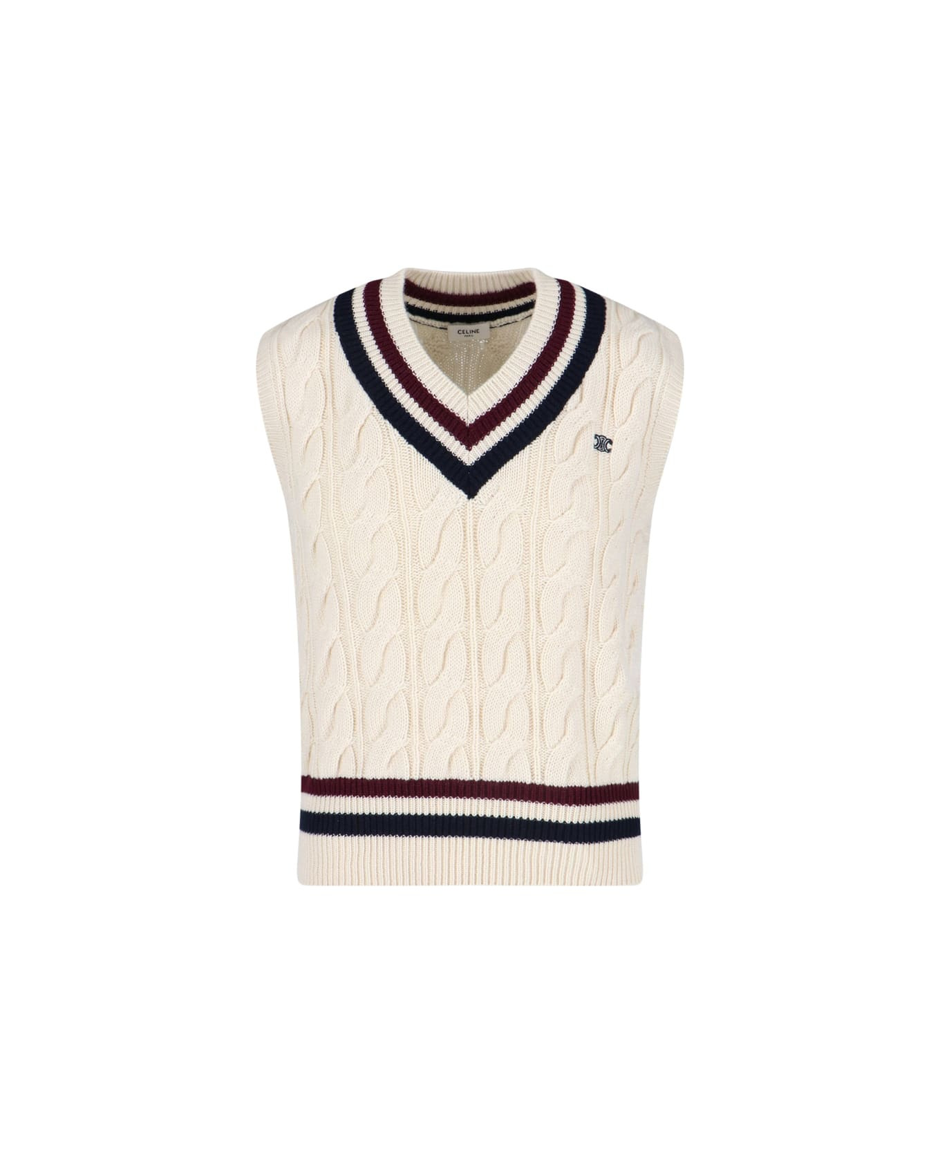 Celine 'Triomphe' vest sweater in cream cashmere with black trim, woven pattern, V-neck, black logo embroidery on the chest, ribbed trims, straight hem. Composition: 100% Cashmere Made in: Italy Color: Cream Size and fit: - vestibilita regolare Model number: RY0BMD062FZV1