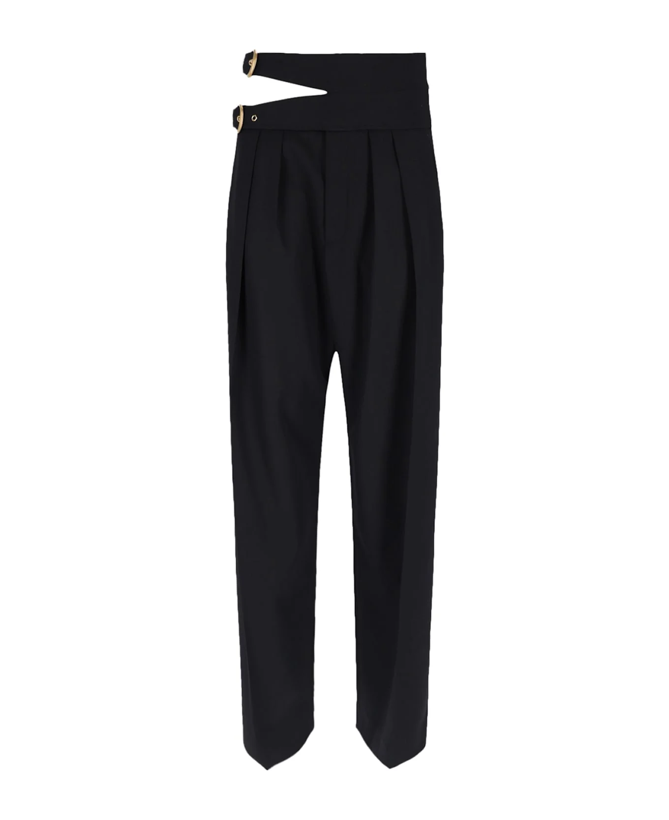 Chloe cut-out pants in black virgin wool, high waist, adjustable gold metal buckles, zip closure, front pin tucks, straight leg. Composition: 100% Virgin Wool Made in: Slovakia Color: Black Size and fit: - vestibilita regolare Model number: 26SPA08067001
