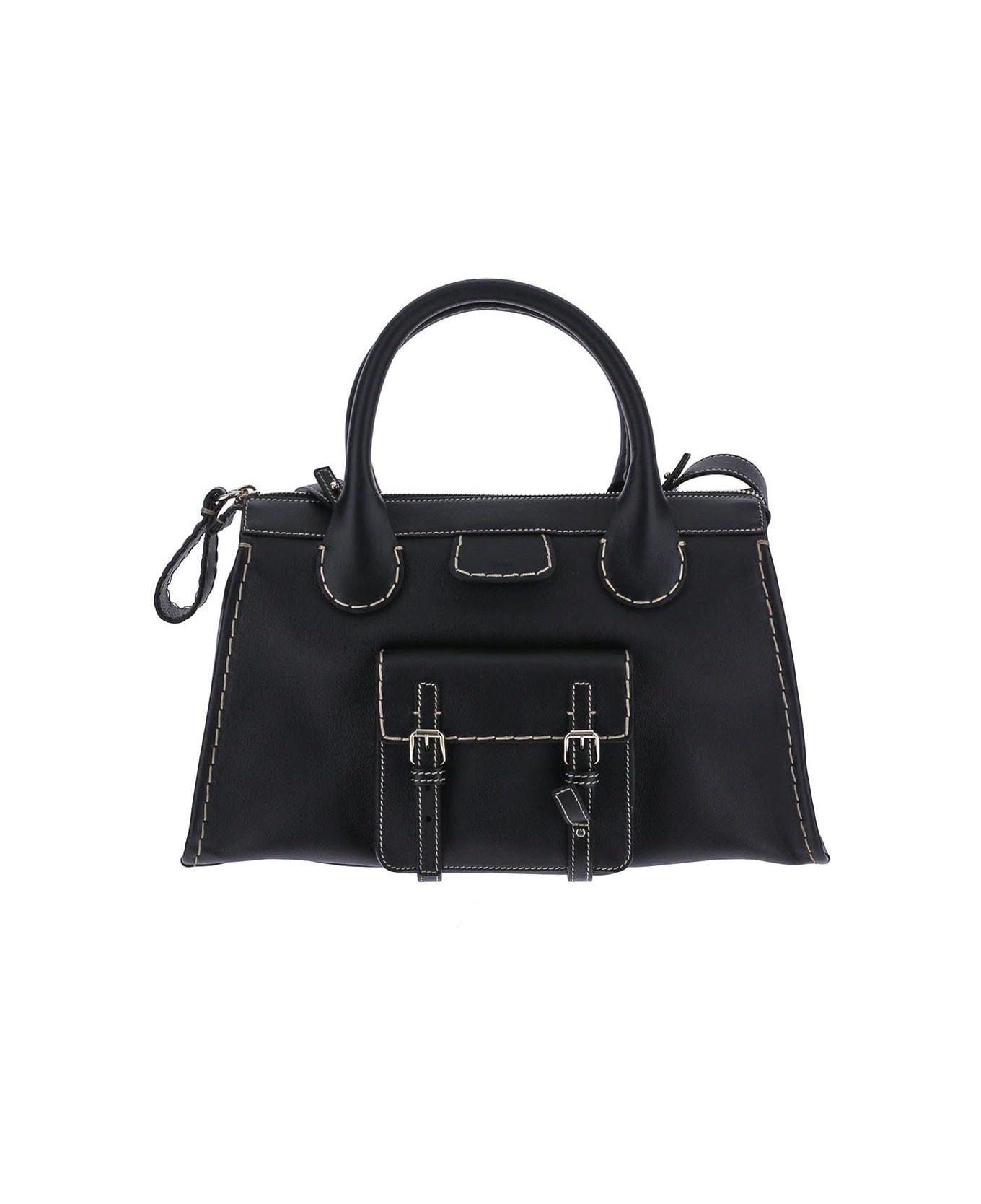 Casual Chloe day bag in black buffalo skin. Is features by oversize zip, external pocket and removable shoulder strap. The design is completed by the brands characteristic saddle stitching and buckle straps. Composition: 100% Leather Made in: Italy Color: Black Size and fit: - Height 23cm, Width 42 cm, Depth 20 cm, Strap 48, Handle 15 Model number: CHC21WS450F43EDITH001