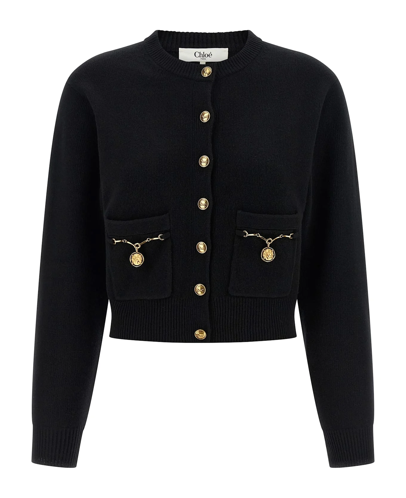 Merino wool and cashmere knit cardigan, crew neck, slightly cropped style, front metal 'Horse Medal' button closure, pockets with jewel details, long sleeves with cuffs and dropped shoulder. Composition: 92% wool 8% cashmere Made in: China Color: Black Size and fit: - true to size fit Model number: CH26SMC07800001
