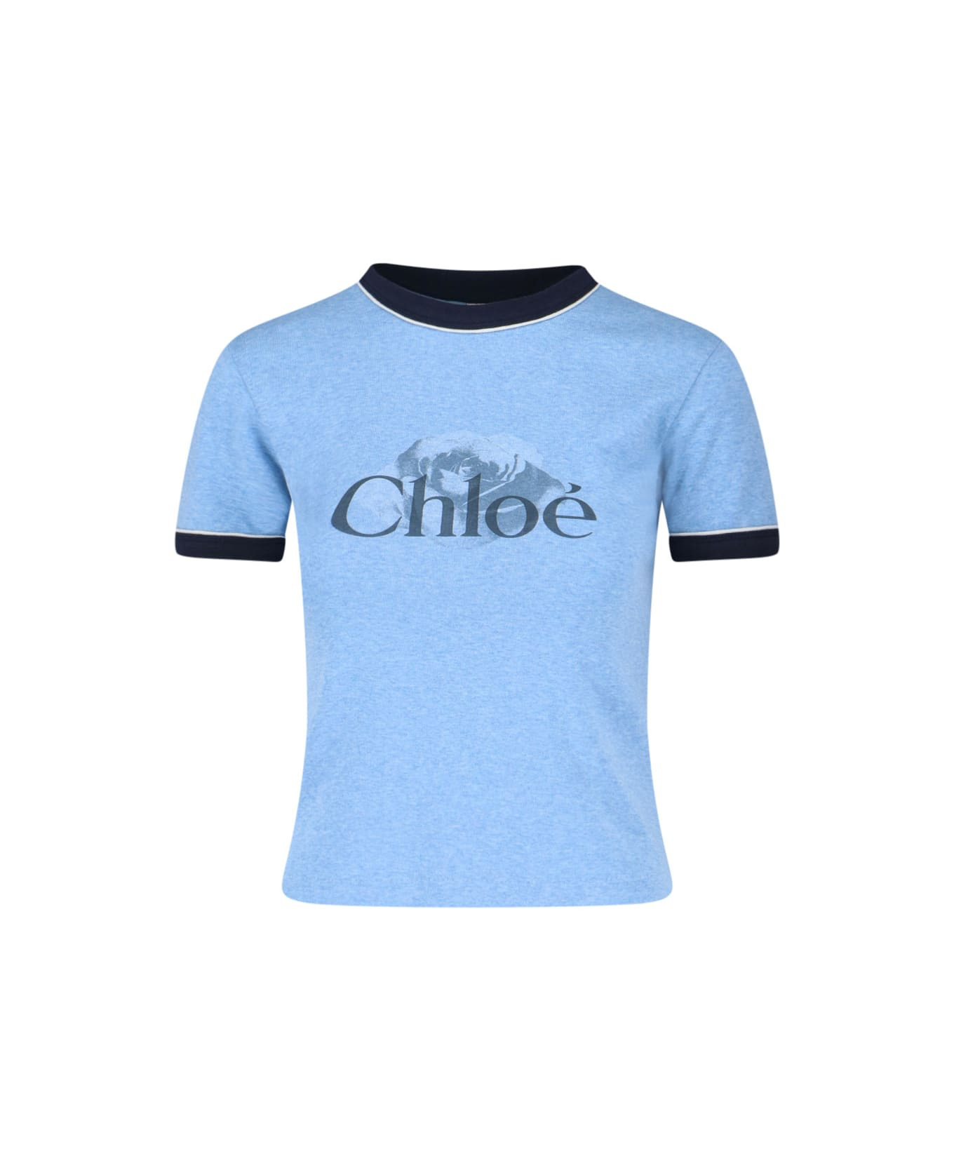 Chloe logo T-shirt in light blue cotton with crew neck, short sleeves, contrast trim, front logo print, ribbed trims, straight hem. Composition: 100% Cotton Made in: Portugal Color: Light Blue Size and fit: - vestibilita slim Model number: 25WJH03198433