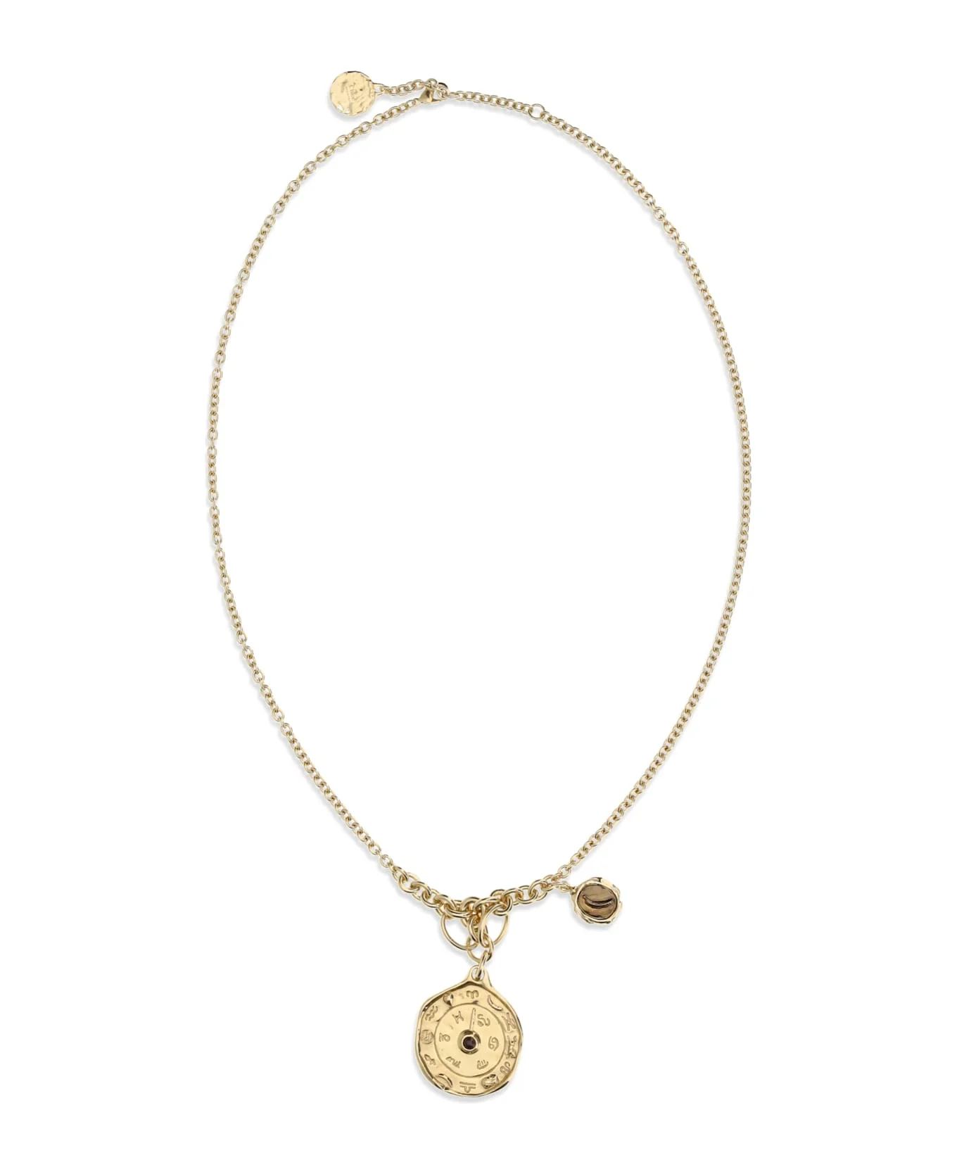 The medals pendant necklace by chloe combines style and personality with a distinctive design. made of brass and embellished with a brecciated red jasper pendant, it is adjustable to fit perfectly around the neck. the chloe logo is engraved on the back of the central medal, while a metal plaque adds further brand detail. the rotating tip allows you to indicate your zodiac sign, making each piece unique and personal. Composition: 100% % Brass Made in: Italy Model number: CH26SJN09BBJ9HA