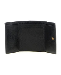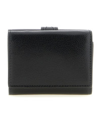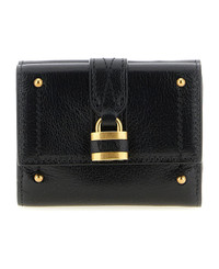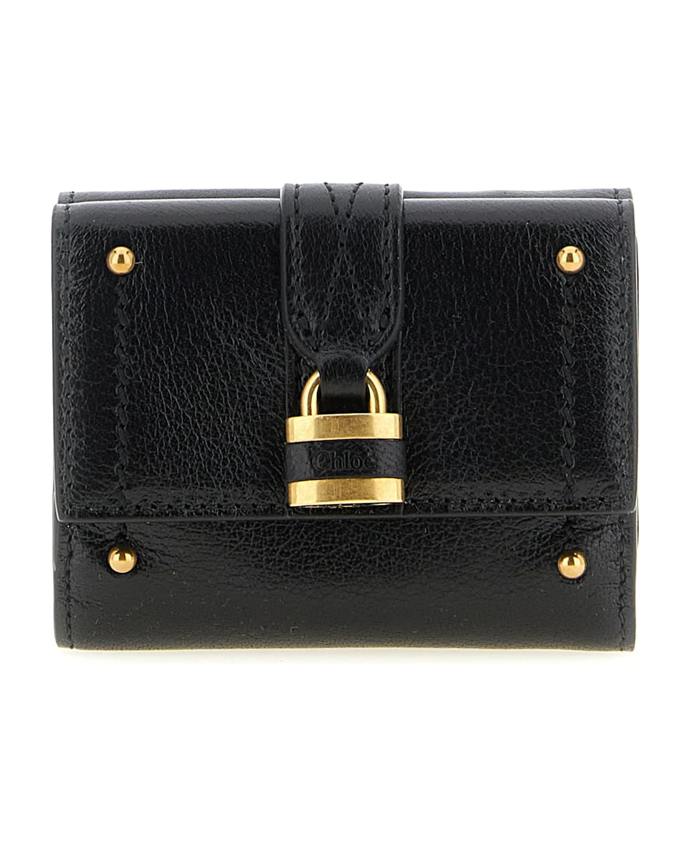 'Paddington' mini wallet in grenade buffalo leather, trifold model, flap closure with snap button on both sides, Gold padlock and front metal studs. SUSTAINABLE: To make this product, Chloe worked with tanneries with Leather Working Group (LWG) certification, which is based on water and energy consumption and chemical, solid waste and slurry management policy. Composition: 100% buffalo leather Made in: Italy Color: Black Size and fit: - W 9.5 x H 8 x D 3 cm Model number: CH26SP914O37001