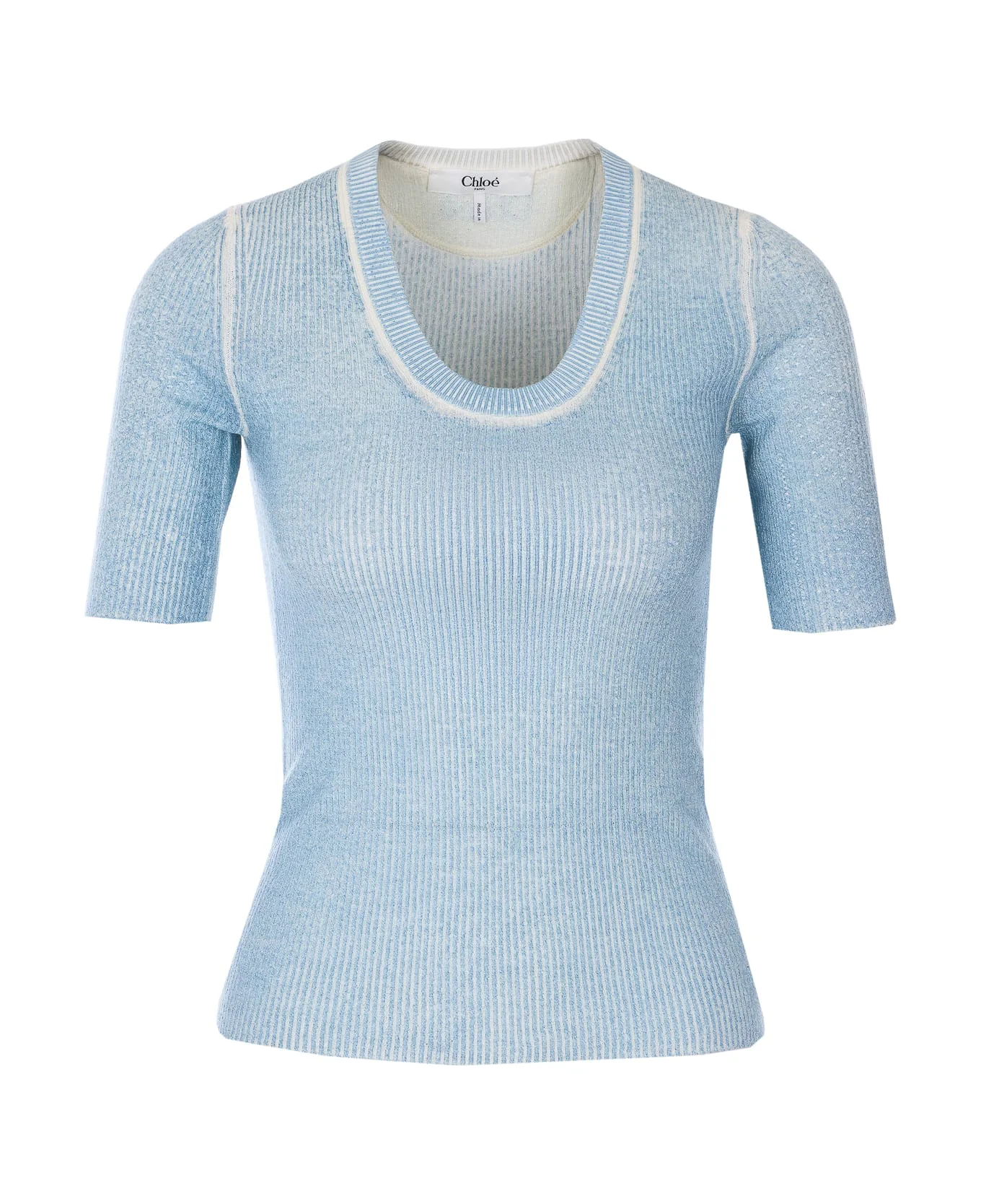 Chloe light blue t-shirt, round collar, short sleeves Composition: 66% Merino Wool, 34% Viscose, 100% Silk Made in: China Color: Blue Size and fit: - US SIZE Model number: 26SMP2551040S