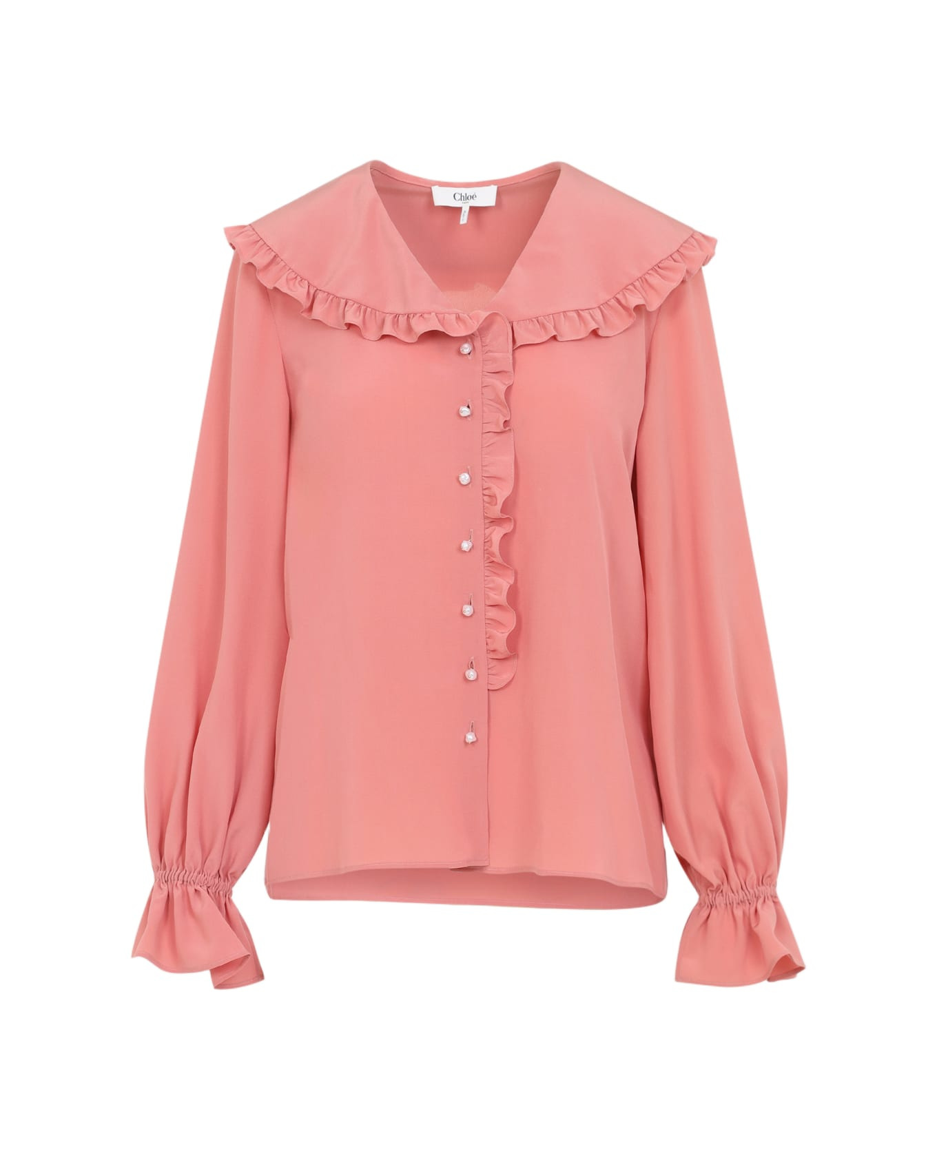 Chloe Pink Silk Blouse. Crafted from pink silk crepe de chine, V-neckline, white pearl button fastening, long sleeves with elastic cuffs, ruffled edges. Made in: France Color: Flaming Coral Model number: CH25WHT780056W2