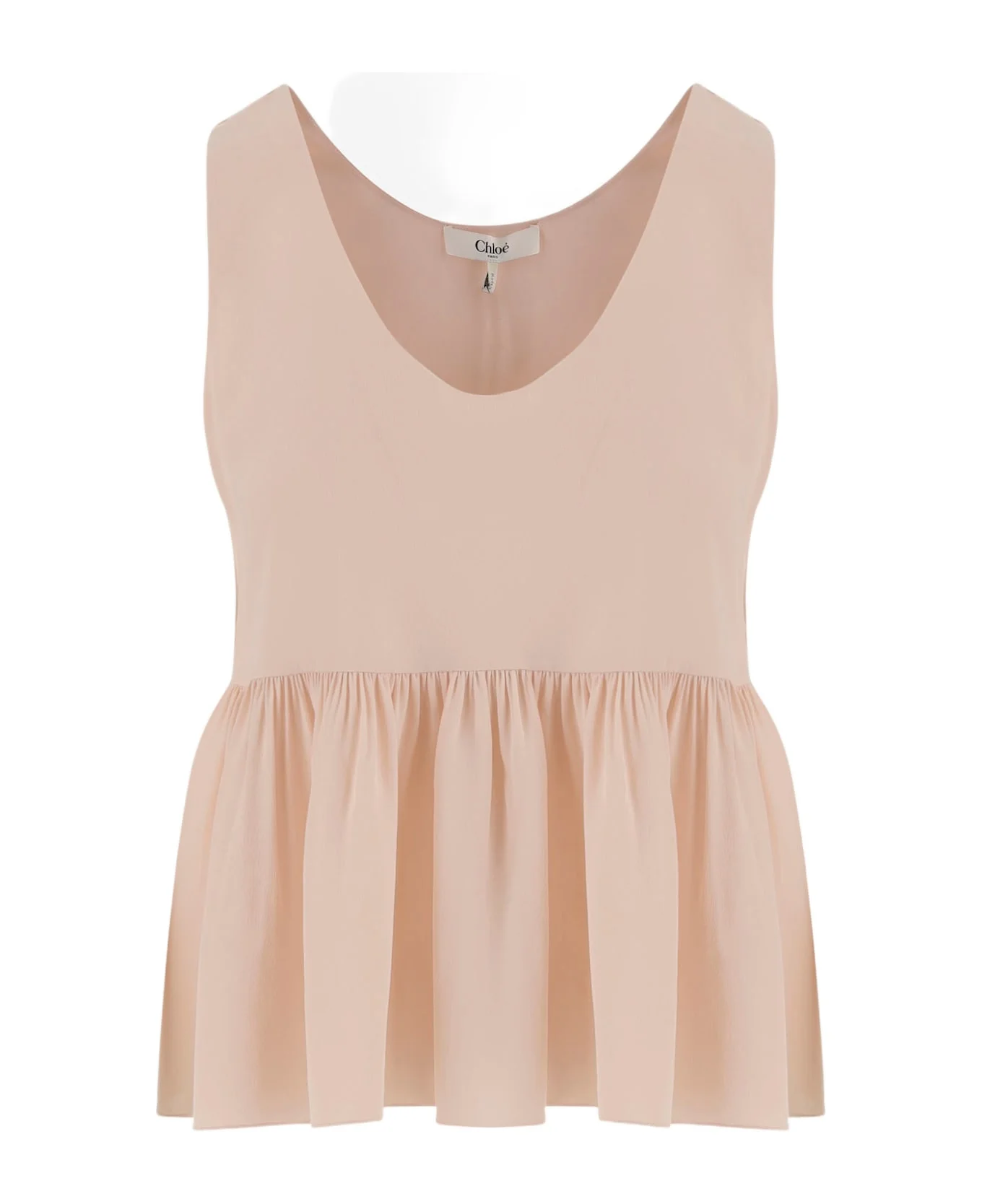 Silk top Wide neck Sleeveless Ruffled hem Slip-on design Light pink Made in Italy Composition: 100% silk Made in: Madagascar Color: Pink Size and fit: - The model is wearing a size 36 FR. - Model measurements: - Height: 175 cm - Chest: 86.5 cm - Waist: 65 cm - Hips: 92 cm - Shoulder: 40 cm Model number: CH26SHT300056H6