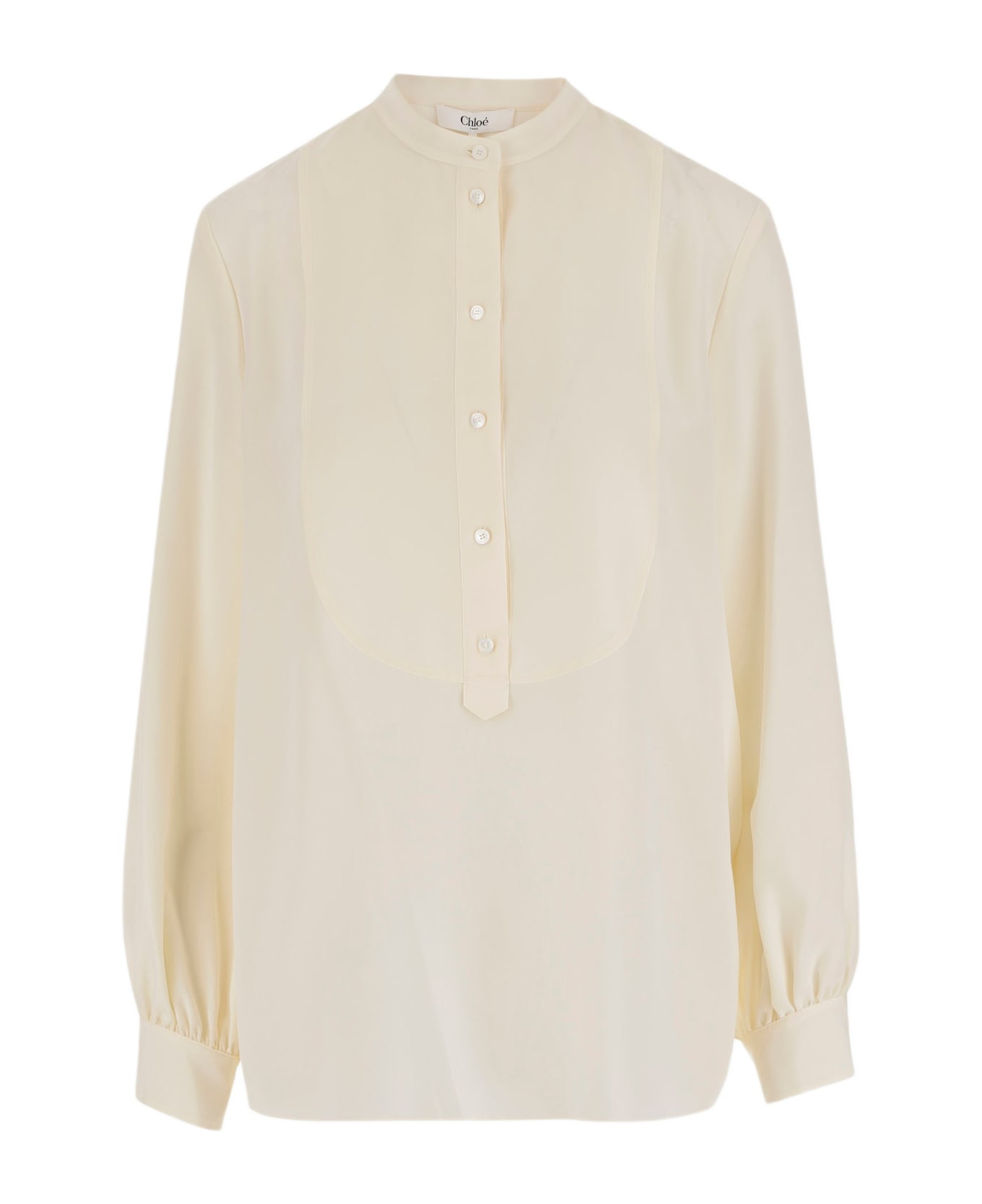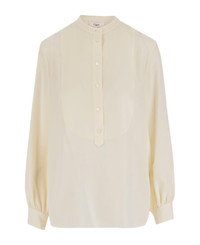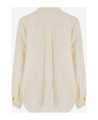 Shirt made of silk Crew neck Mandarin collar Long sleeves Front button closure Cream Made in Italy. Composition: 100% silk Made in: Italy Color: Ivory Size and fit: - The model is wearing size 38 FR. - Model measurements: - Height: 175 cm - Chest: 86.5 cm - Waist: 65 cm - Hips: 92 cm - Shoulder: 40 cm - Model number: CH25AHT17077114