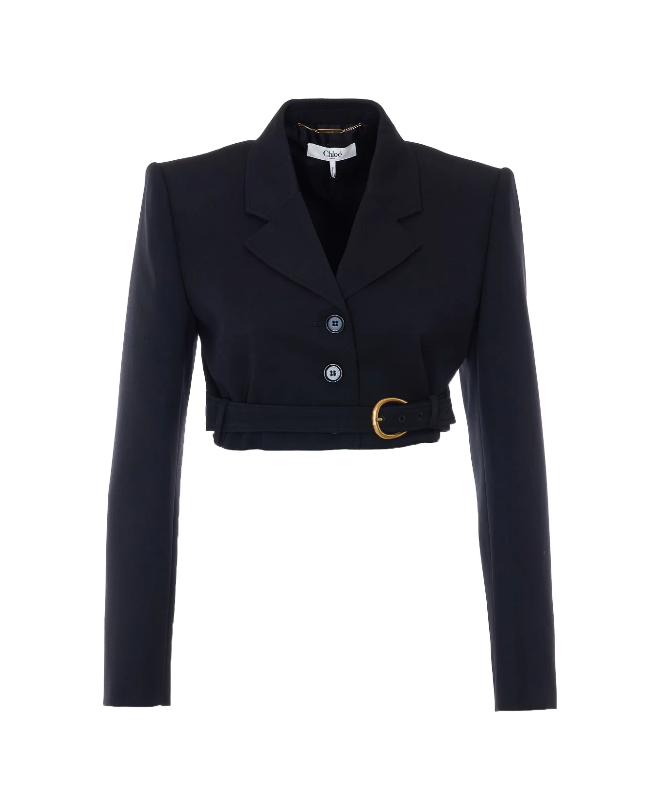 Chloe black cropped jacket, long sleeves, v-neck, buttons closure, belt at bottom, long sleeves, buttons on cuffs, reinforced shoulder Composition: 100% Virgin Wool, 100% Silk, 100% Virgin Wool Made in: Italy Color: Black Size and fit: - EU SIZE (IT) Model number: 26SVE71067001