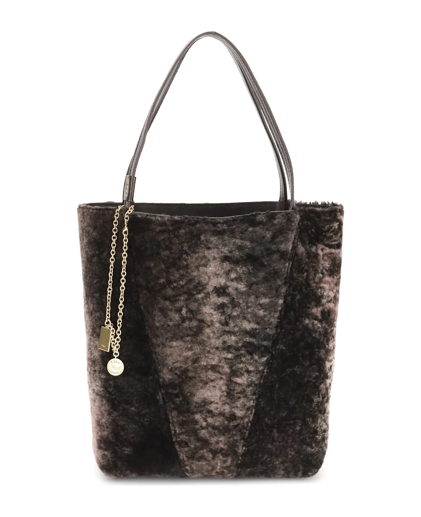 The spin shearling tote bag by chloe is a dark brown shearling tote accented with gold-tone hardware. it features double handles and a decorative chain with chloe and horse pendants. the tone-on-tone interior completes the refined design. it can be worn over the shoulder or carried by hand by slipping the handles inside the ring for convenience. Composition: 100% % Calf Leather Bos Taurus Made in: Italy Size and fit: - W 27 x H 30 x D 14 cm Model number: CH25WS811Q4524X