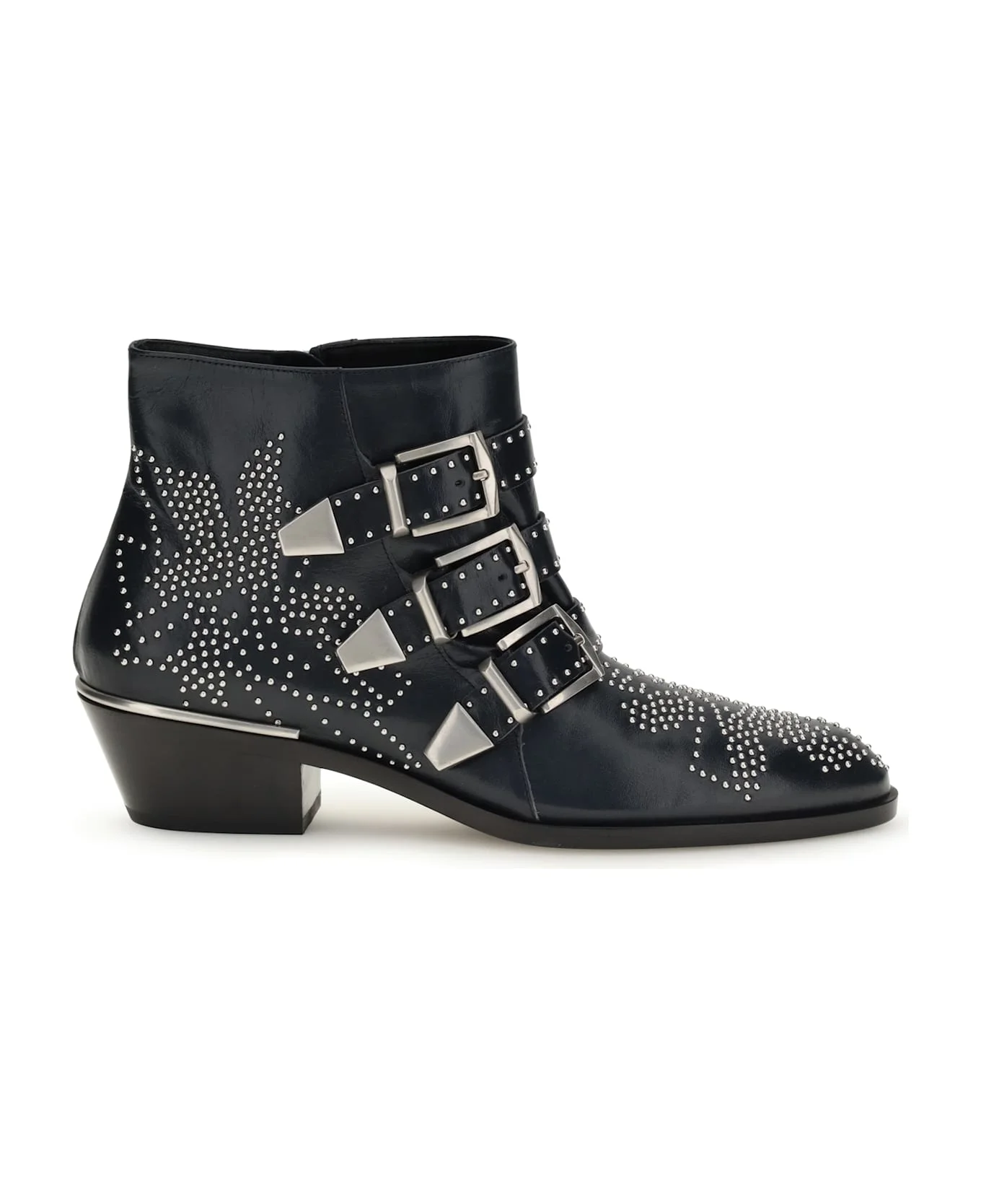 The susan boots by chloe represent a style icon with rock and sophisticated appeal. made of soft leather, they feature an upper embellished with micro metal studs and a triple strap closure that lends character to the design. the side zipper facilitates the fit, while the leather lining and insole ensure comfort and quality craftsmanship. the leather sole and regular fit complete the model, ideal for a bold yet refined look. Composition: 100% % Calf Leather Bos Taurus Made in: Italy Size and fit: - 4 cm Model number: CH26S134WF43Y