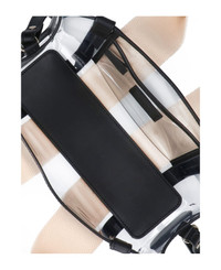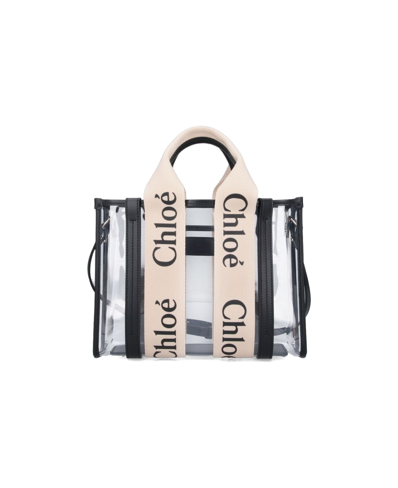 Chloe Woody small tote bag in transparent fabric with leather trim, two handles, black logo pattern, adjustable and removable shoulder strap, inner flat pocket, main inner compartment. Composition: 100% Thermoplastic Polyurethane Made in: Italy Color: BLACK Size and fit: - A 20 x L 26.5 x P 8 cm Model number: 25US397P65101