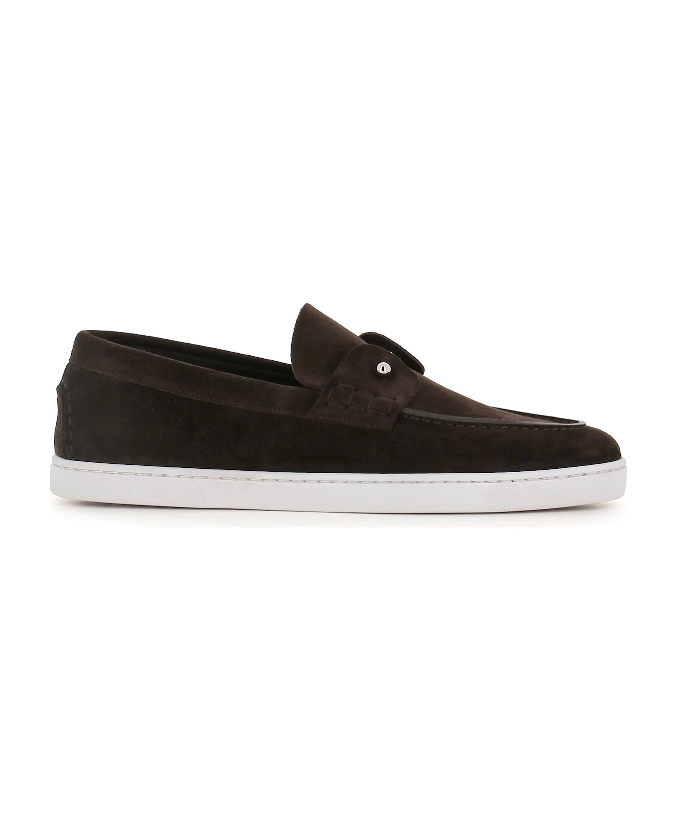 Dark brown men's leather Slip-op by Christian Louboutin, feauturing by a metal collar pin. Lined interior. Rubber sole. Removable insole. Heel: 2 cm Composition: Suede Made in: Italy Color: Coffee Size and fit: - Fits true to size. Model number: CHAMBELIBOATFLAT