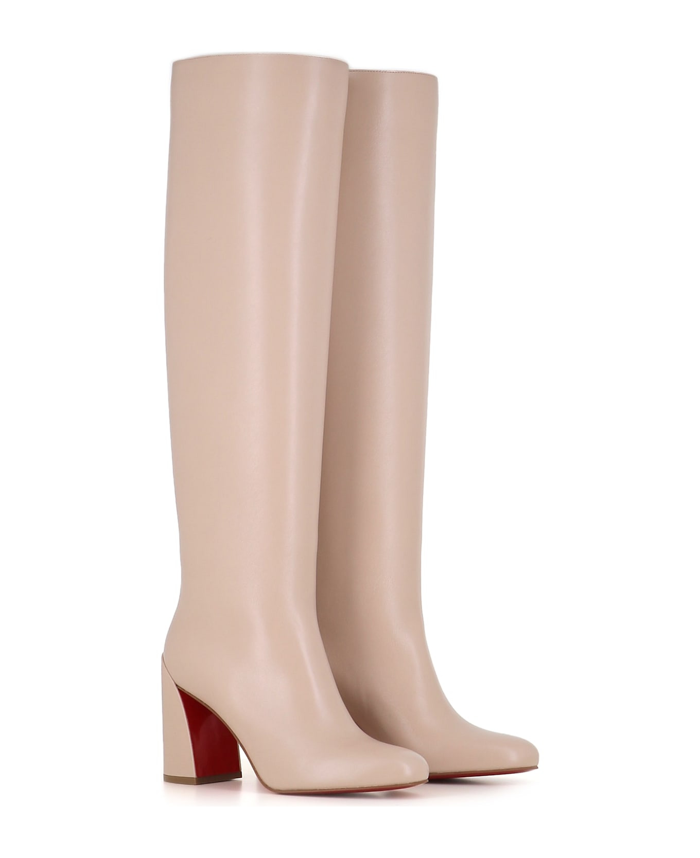 Ivory women's leather high boot by Christian Louboutin. Leather sole with rubber. Lined interior. Heel: 8,5 cm Leg height: 47,5 cm Circumference: 39,5 cm Composition: Leather Made in: Italy Color: Ivory Size and fit: - Fits true to size. Model number: JANITA85/SUGAR