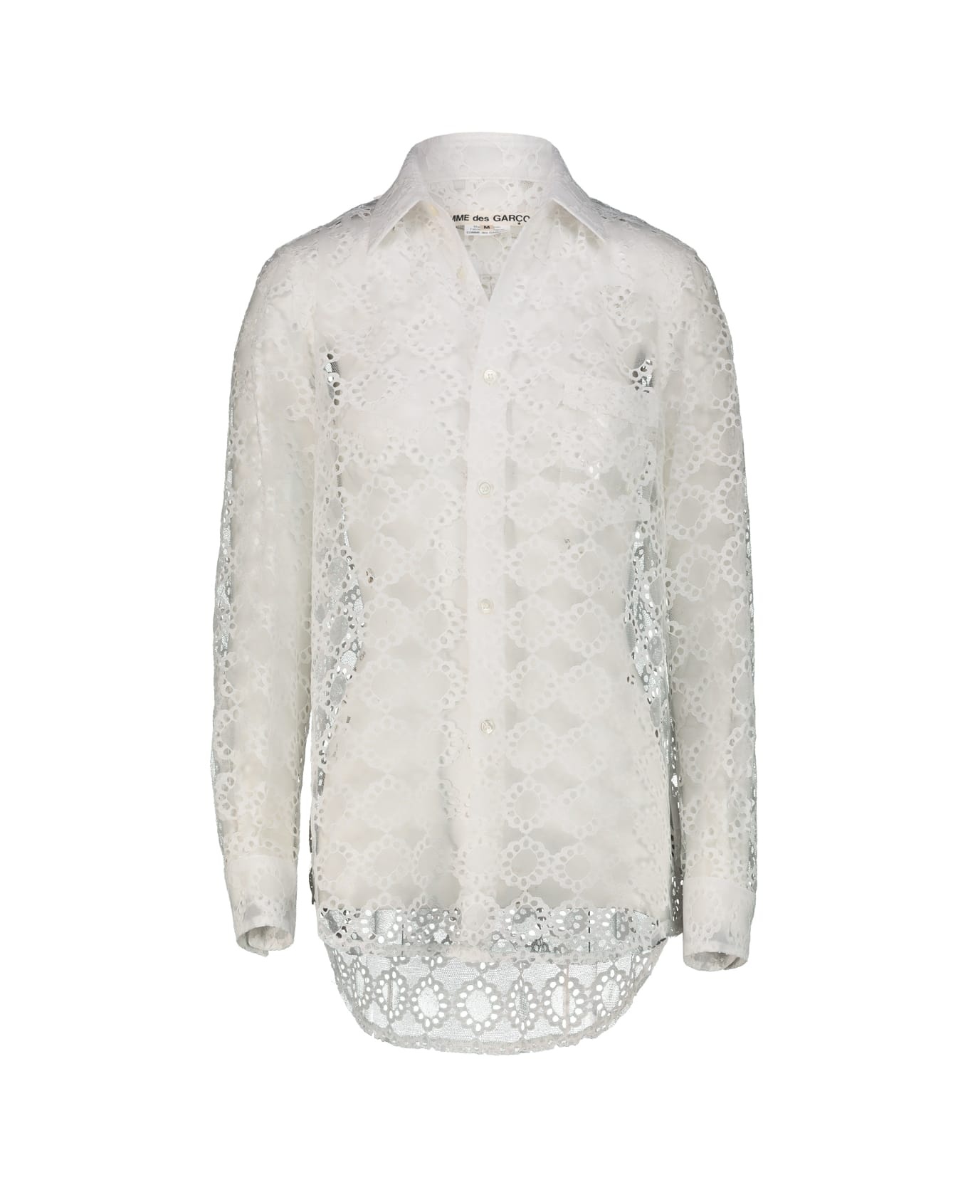 Comme des Garcons white shirt with long sleeves in technical San Gallo lace, patch pocket on the front, rounded on the bottom. GTIN CODE: GO B013 Made in: Japan Color: White Model number: GOB013