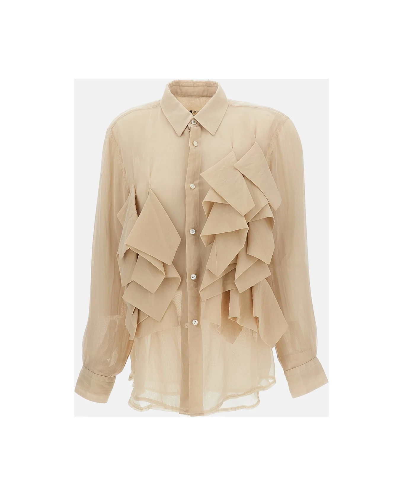 Semi-sheer double-layer shirt Ruffle detail on the front Double front button closure Double buttoned cuffs Pointed collar Patch pocket on the front Color: beige Composition: 100% Polyester Color: Beige Model number: GQB0010512
