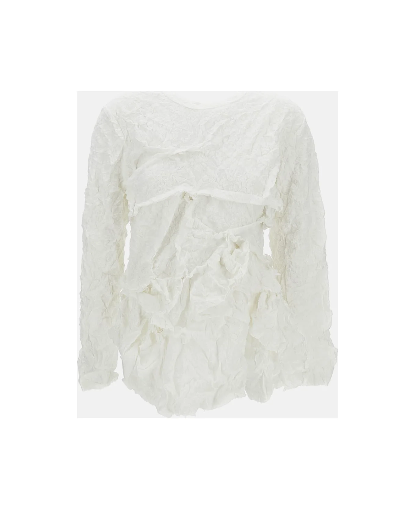 Crew neck long-sleeve top Asymmetric Structured fabric with a crinkled effect Ruffle detail Color: white Composition: 100% Polyester Color: White Model number: GQT0190511