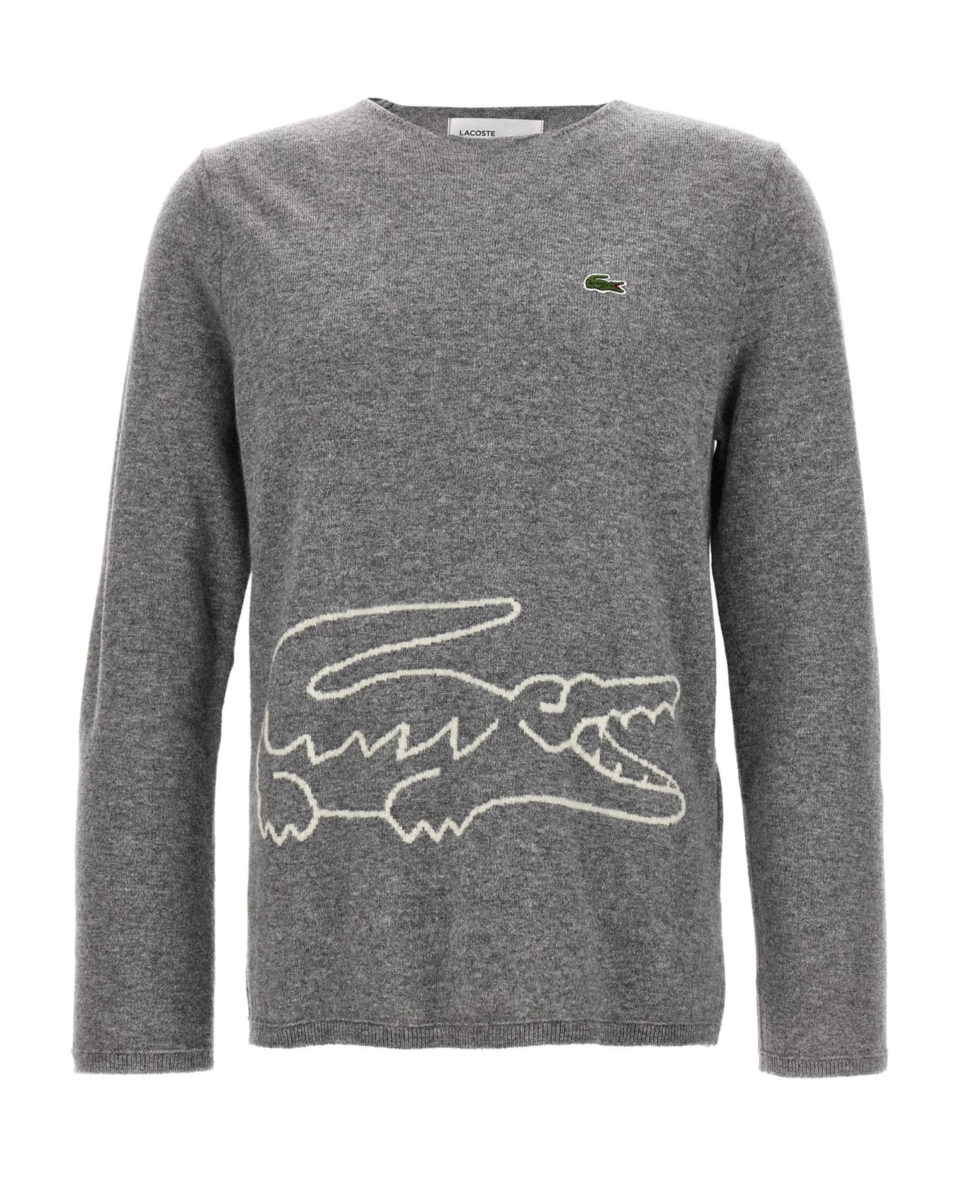 Comme Des Garcons x Lacoste wool, crewneck sweater with intarsia and logo patch. Composition: 100% wool Made in: Italy Color: Gray Size and fit: - true to size fit Model number: FLN003W233