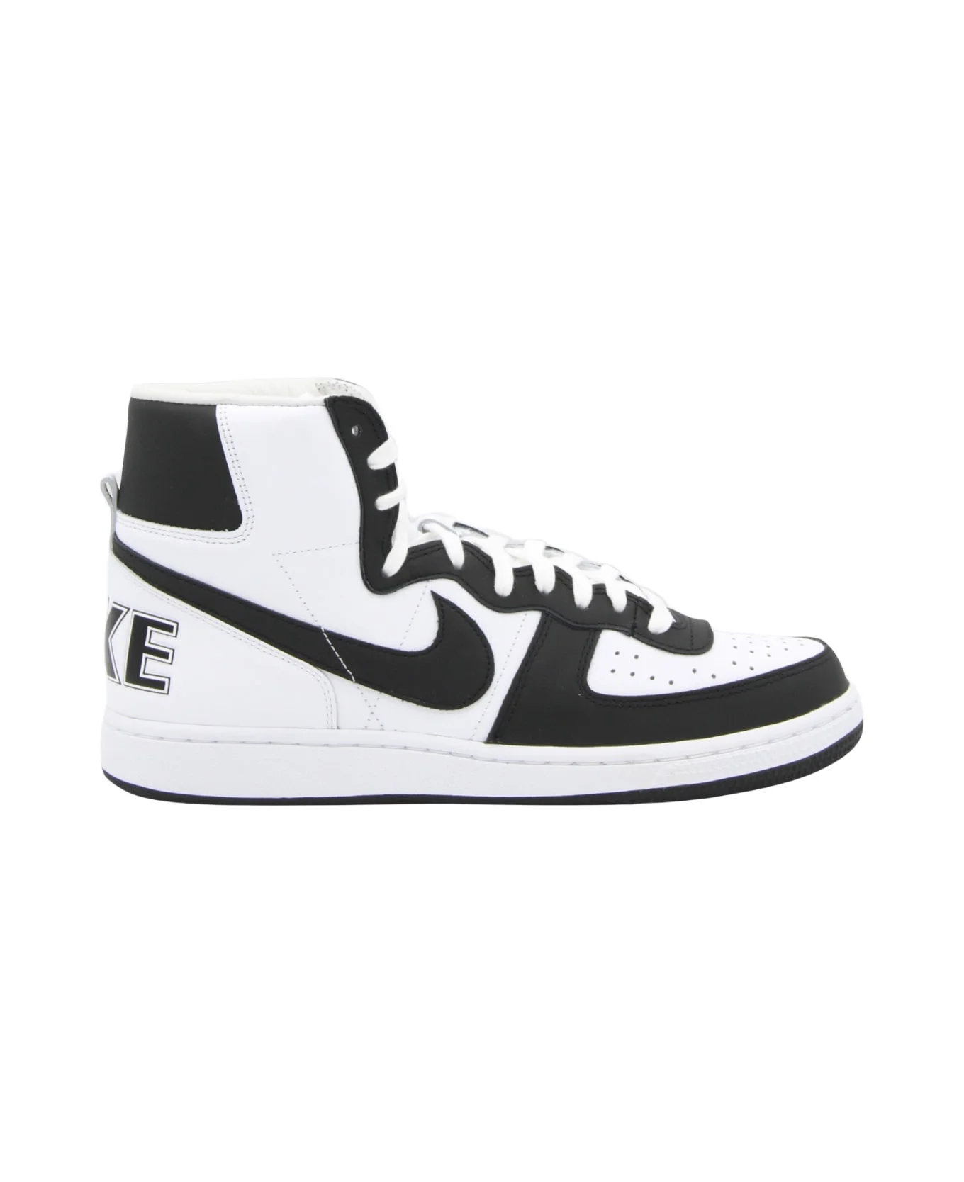 White and black leather sneakers from Comme des Garcons Homme Plus x Nike Terminator featuring round toe, lace-up fastening, front perforated panel, side logo motif, contrast panels and rear logo motif. Composition: _cover, 100% Le Sole, 100% Elastodiene Made in: China Color: Black Model number: PKK1050011