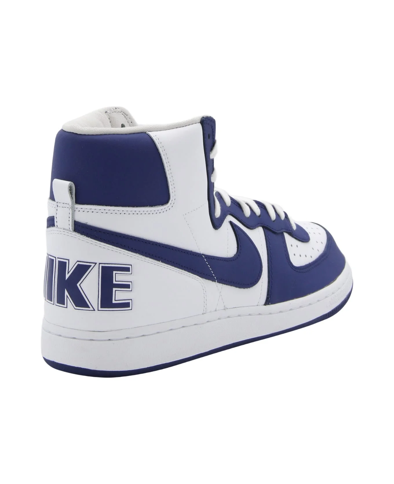 White and blue leather sneakers from Comme des Garcons Homme Plus x Nike Terminator featuring round toe, lace-up fastening, front perforated panel, side logo motif, contrast panels and rear logo motif. Composition: _cover, 100% Le Sole, 100% Elastodiene Made in: China Color: Blue Model number: PKK1050012